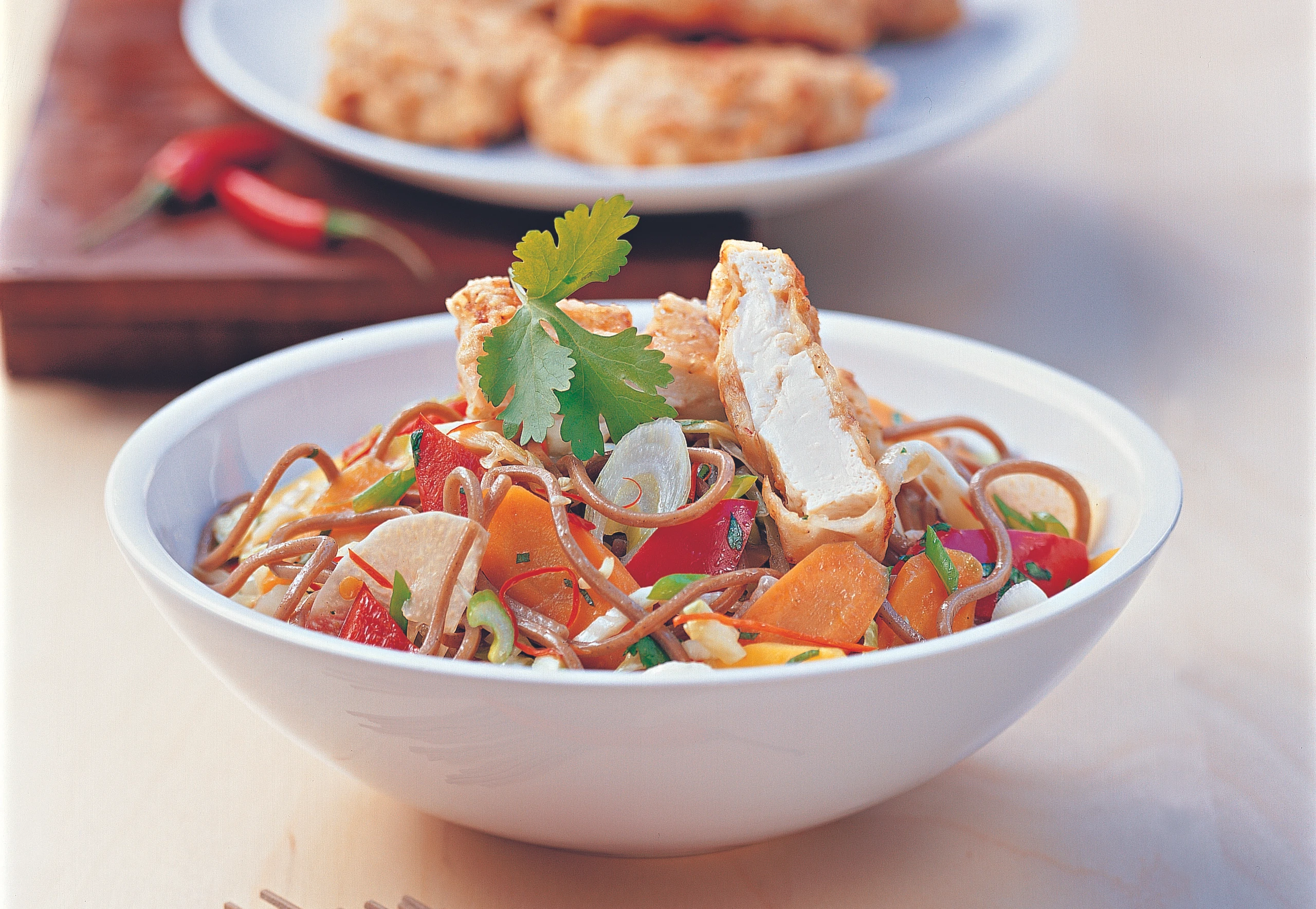 Sesamöl im Wok erhitzen, Gemüse, Knoblauch, Ingwer und Chili darin knackig braten und mit Salz, Soja- und Chilisauce würzen. Nudeln und Koriander untermischen und mit gebackenem Tofu servieren.