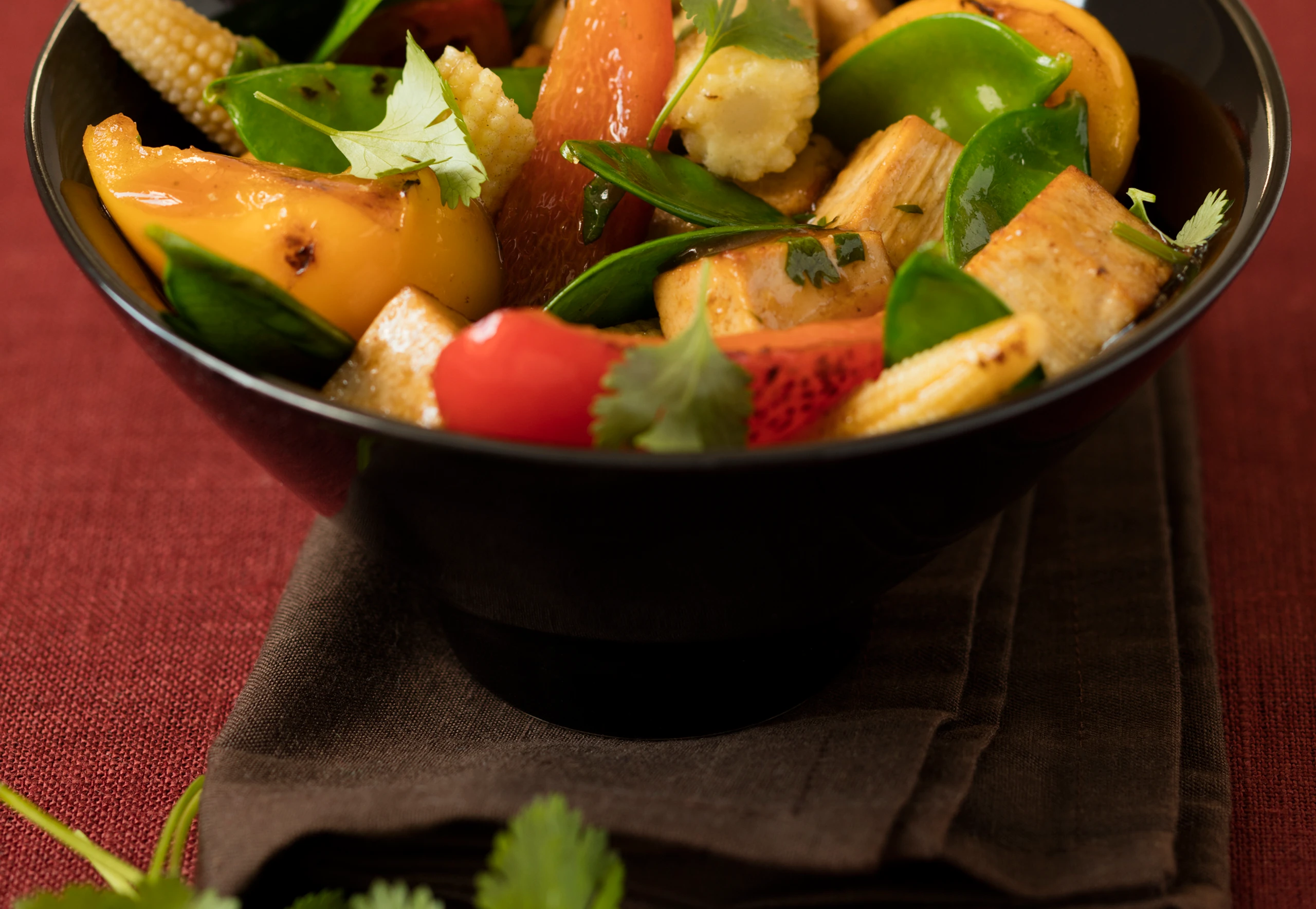 Im Bratrückstand Gemüse anbraten, salzen, pfeffern und mit Suppe ablöschen. Tofu, Marinade und Koriander untermischen, erhitzen und anrichten. Dazu passt Reis.
