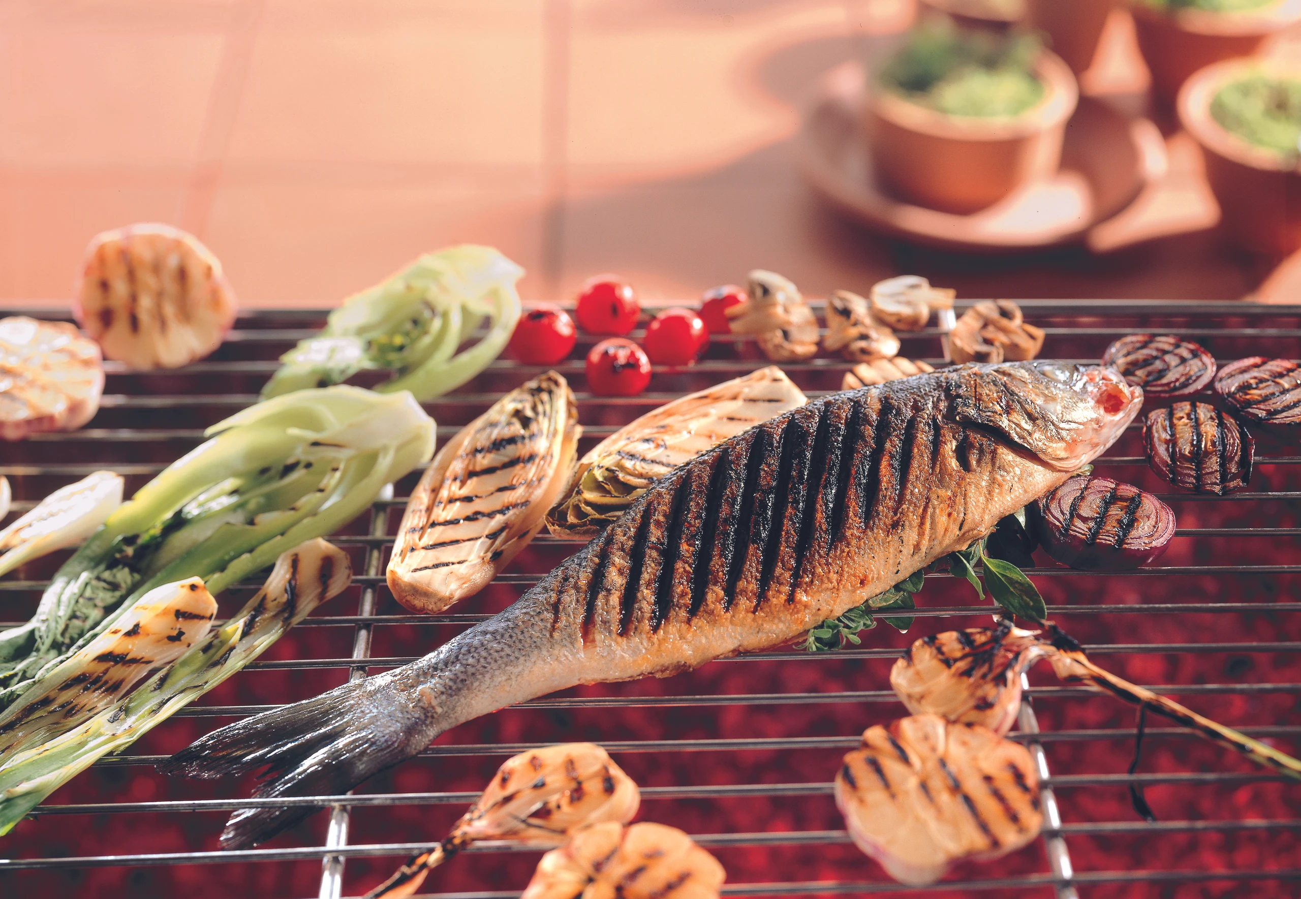 Fische bei milder Hitze beidseitig grillen (insgesamt 8 Minuten). Gemüse und Fische anrichten, Gemüse mit Balsamessig beträufeln. Dazu passt am besten Baguette.