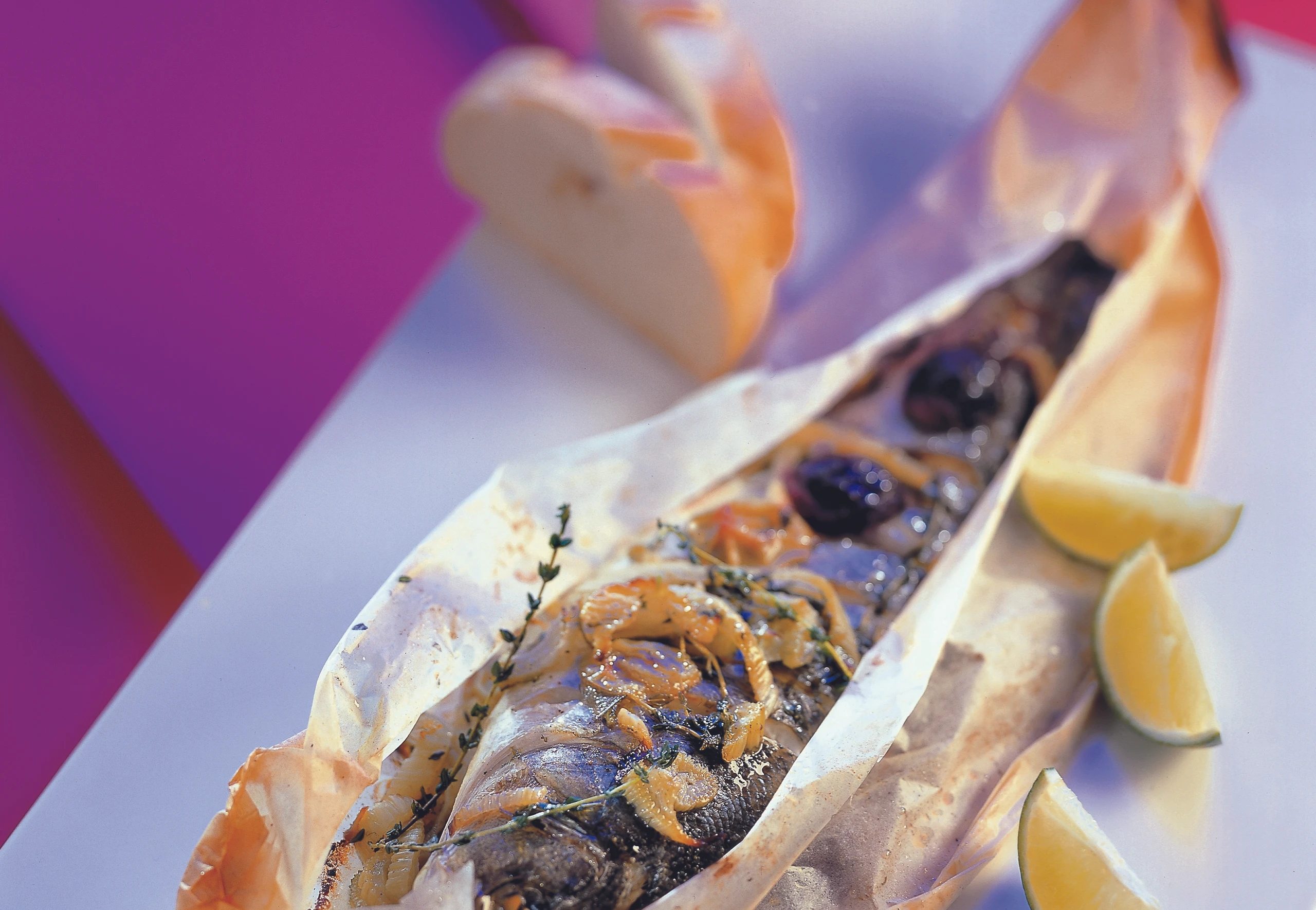 Die Haut der Fische im Abstand von ca. 1 1/2 cm nicht zu tief einschneiden. Fische mit Salz, Pfeffer, Limettensaft und Limettenschale rundum würzen. Aus Backpapier herzförmige Stücke ausschneiden. Fische darauf legen, mit Gemüse bedecken und mit entstandenem Saft beträufeln. Papierrand mit Butter bestreichen, unbelegtes Papier über den Fisch schlagen und rundum eindrehen.