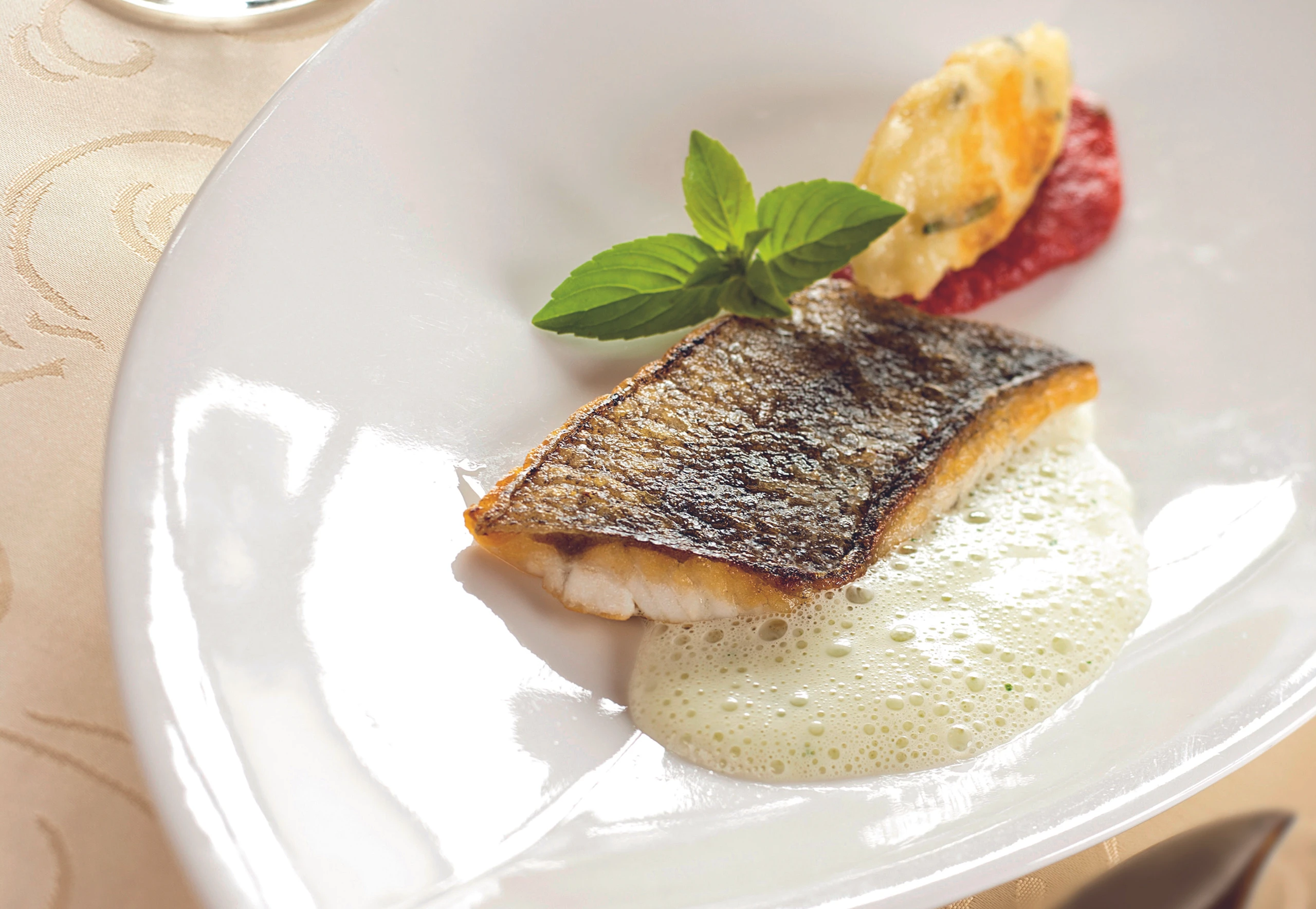 Wolfsbarschfilet mit Pestoschaum und Topfennockerl