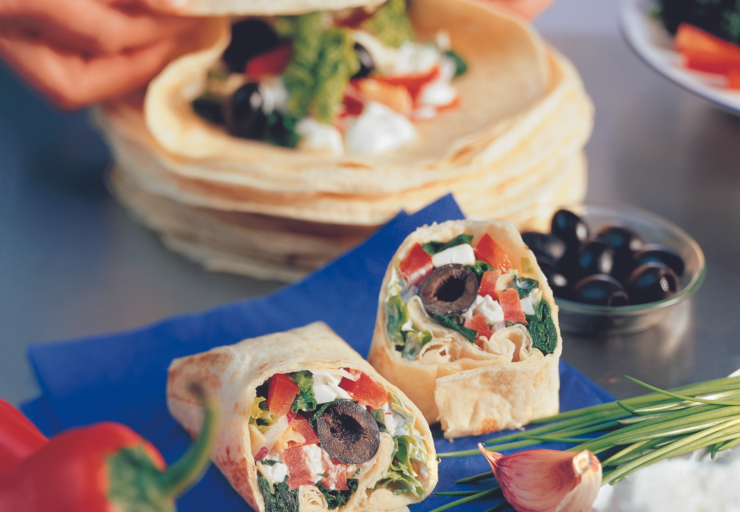 Tortillas aus dem Rohr nehmen, mit Spinat, Paprika, Zwiebel, Schafkäse und Oliven belegen. 2–3 EL Kräuter-Joghurt-Salsa darüber verteilen. Tortillas seitlich einschlagen und einrollen. Wraps halbieren und sofort servieren.