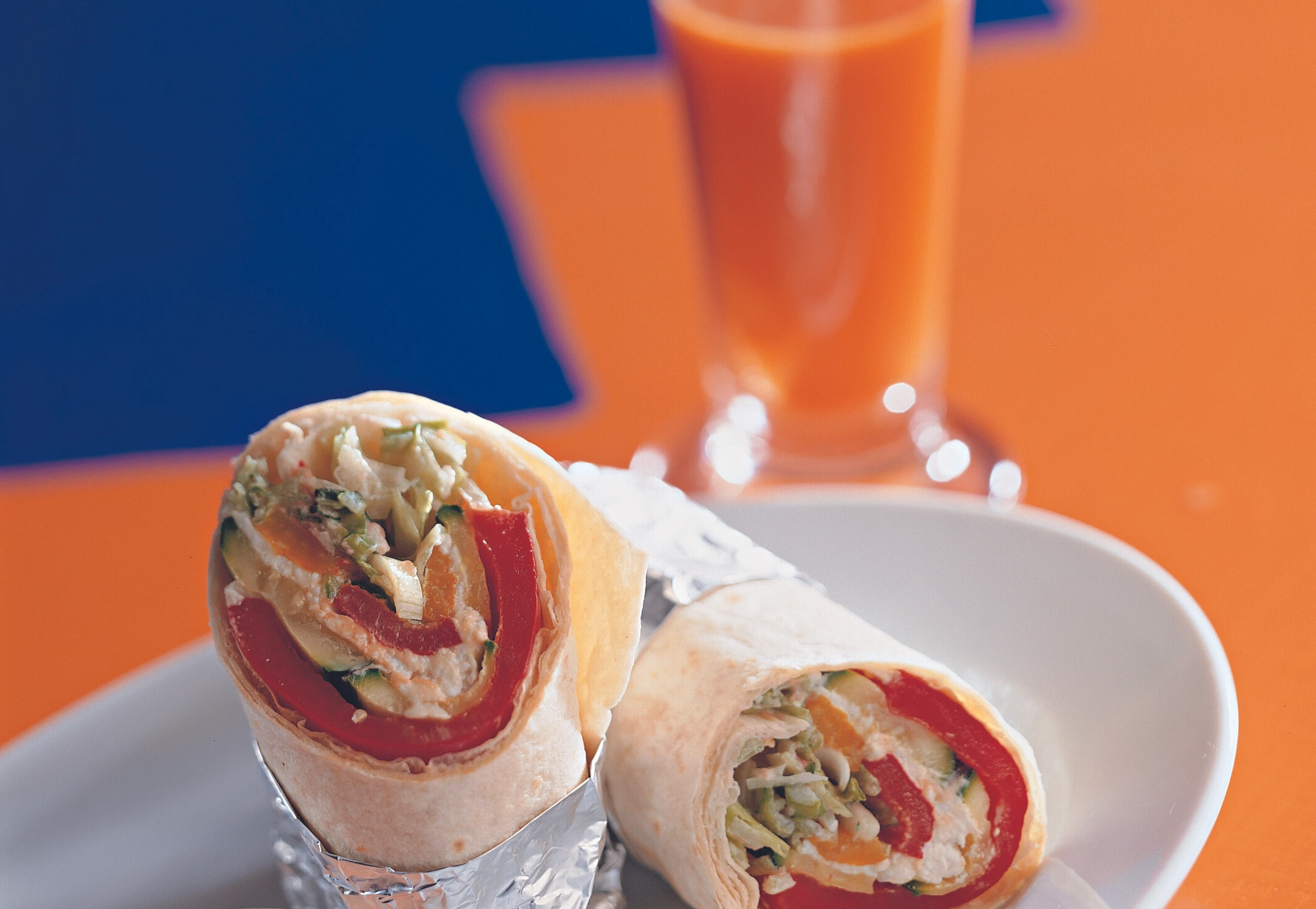 Wraps seitlich einschlagen und fest einrollen. Wraps schräg halbieren und in Alufolie wickeln.