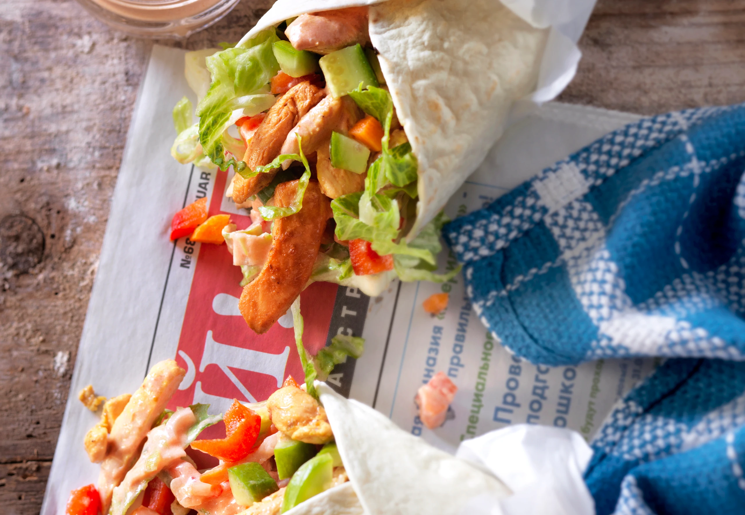 Tortillas auflegen, mittig mit Salatstreifen belegen, Gemüse und Hühnerfleisch darauf legen. Wrap von einer Seite einschlagen und einrollen. Wraps in Papiersackerln stecken, mit Spagat zusammenbinden. Übrige Salsa zu den Wraps reichen.