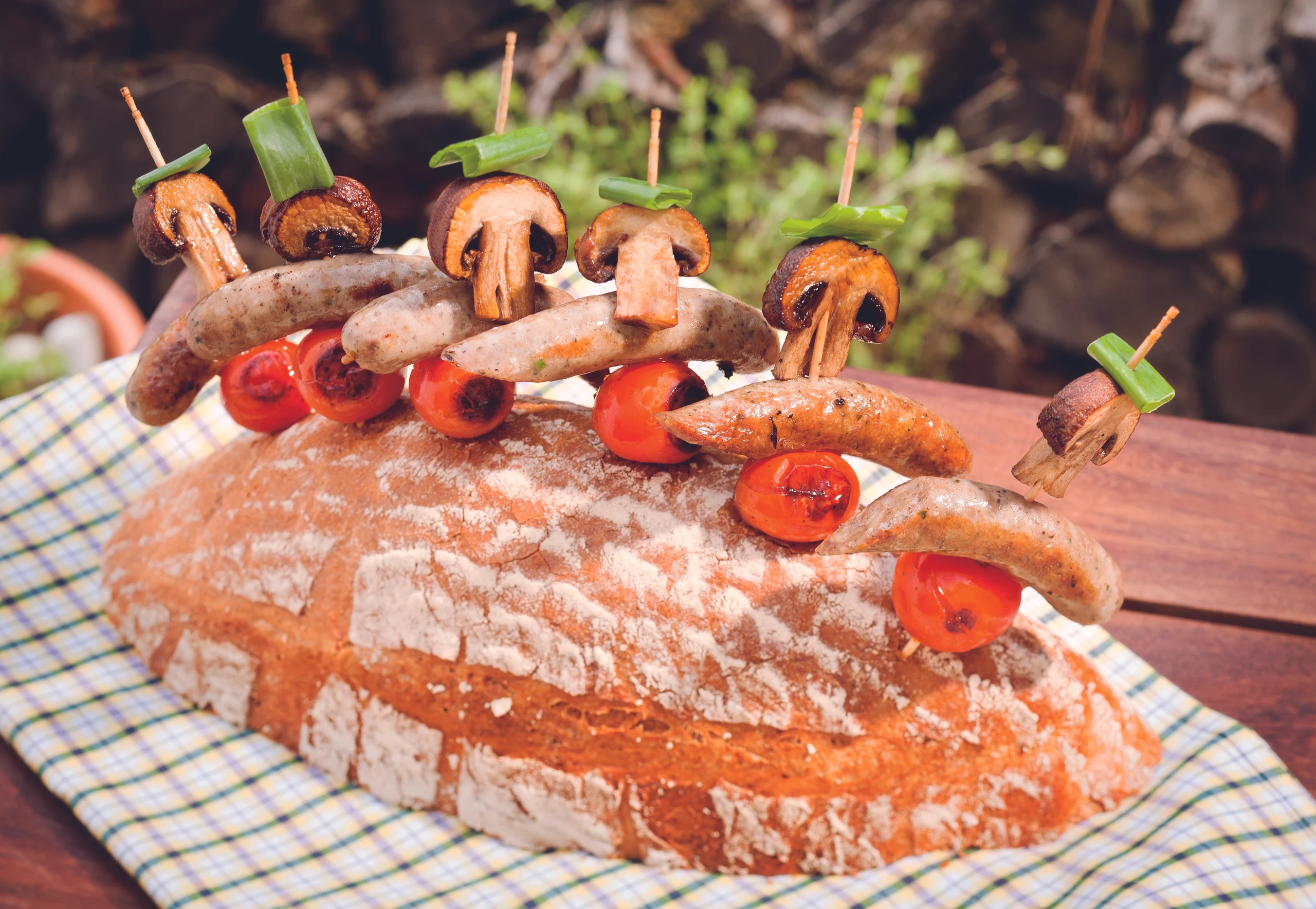 Spieße in das Brot stecken, mit Jungzwiebelgrün garnieren und mit Senf servieren. Vom Brot Scheiben abschneiden, eventuell grillen und zu den Würsteln servieren.