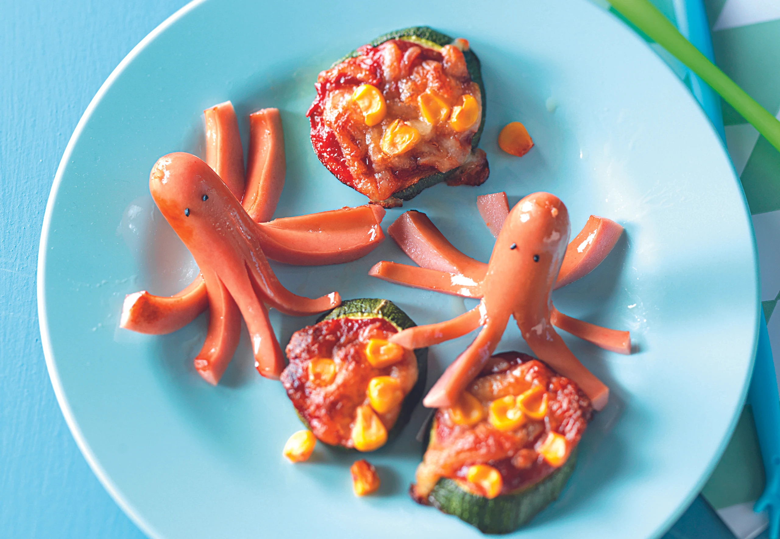 Würstel-Kraken mit den Zucchini-Schatzinseln anrichten.