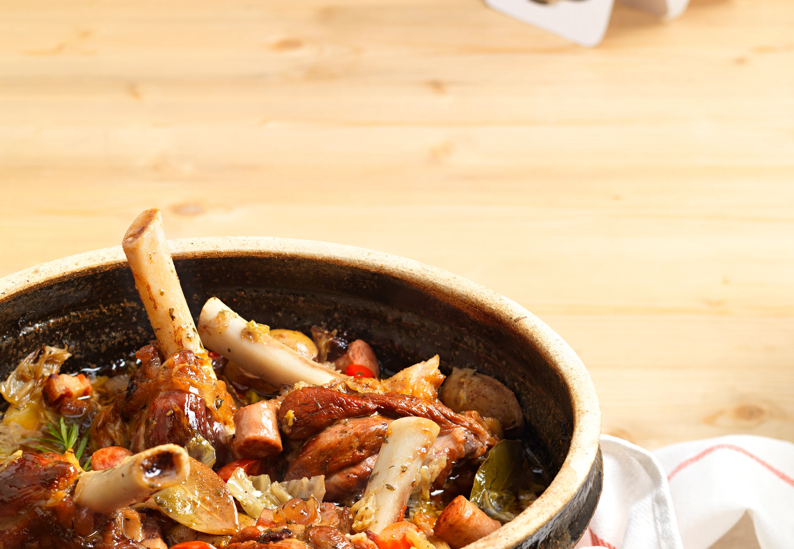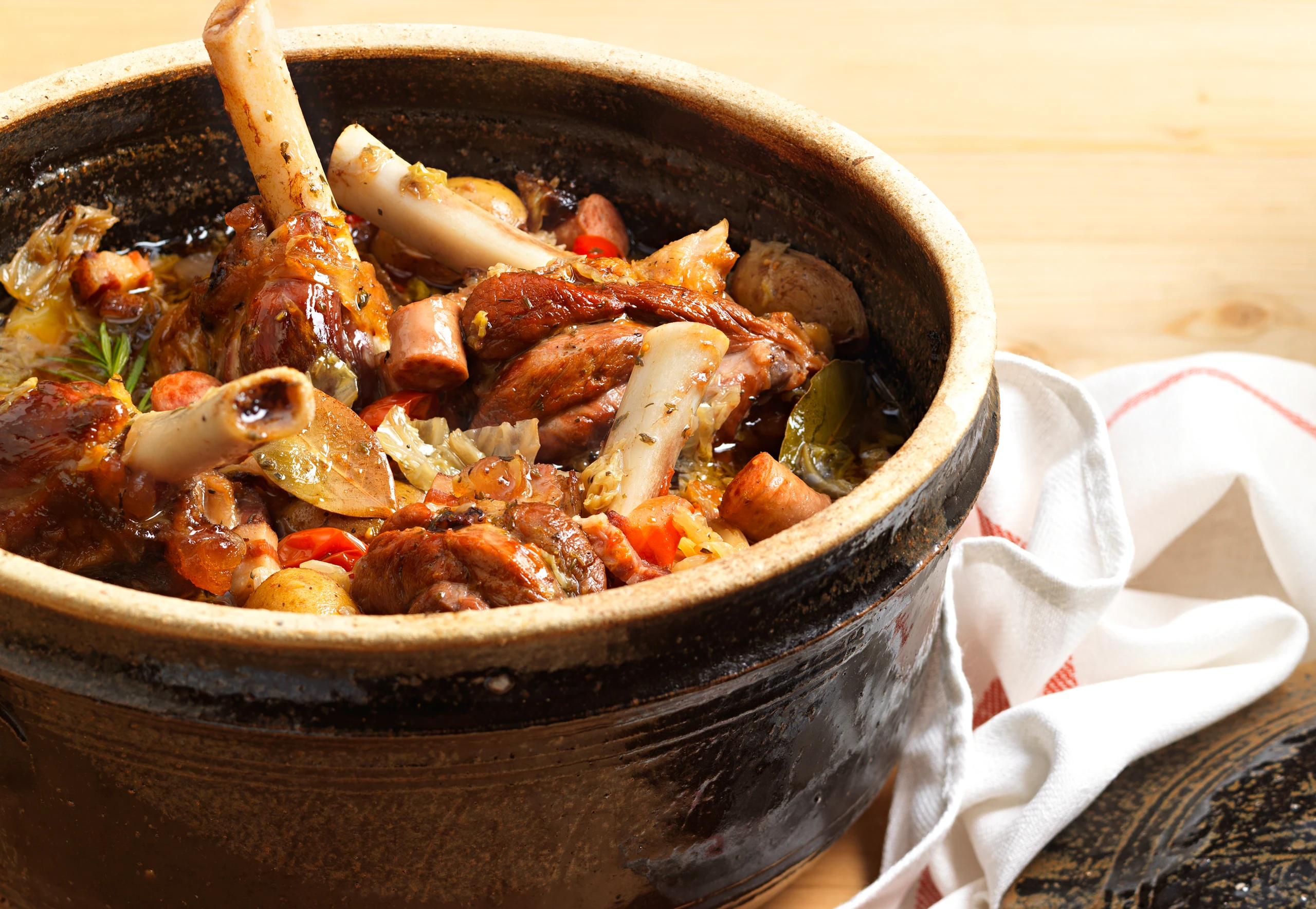 Würzig geschmorte Lammstelzen mit Gemüse und Speck