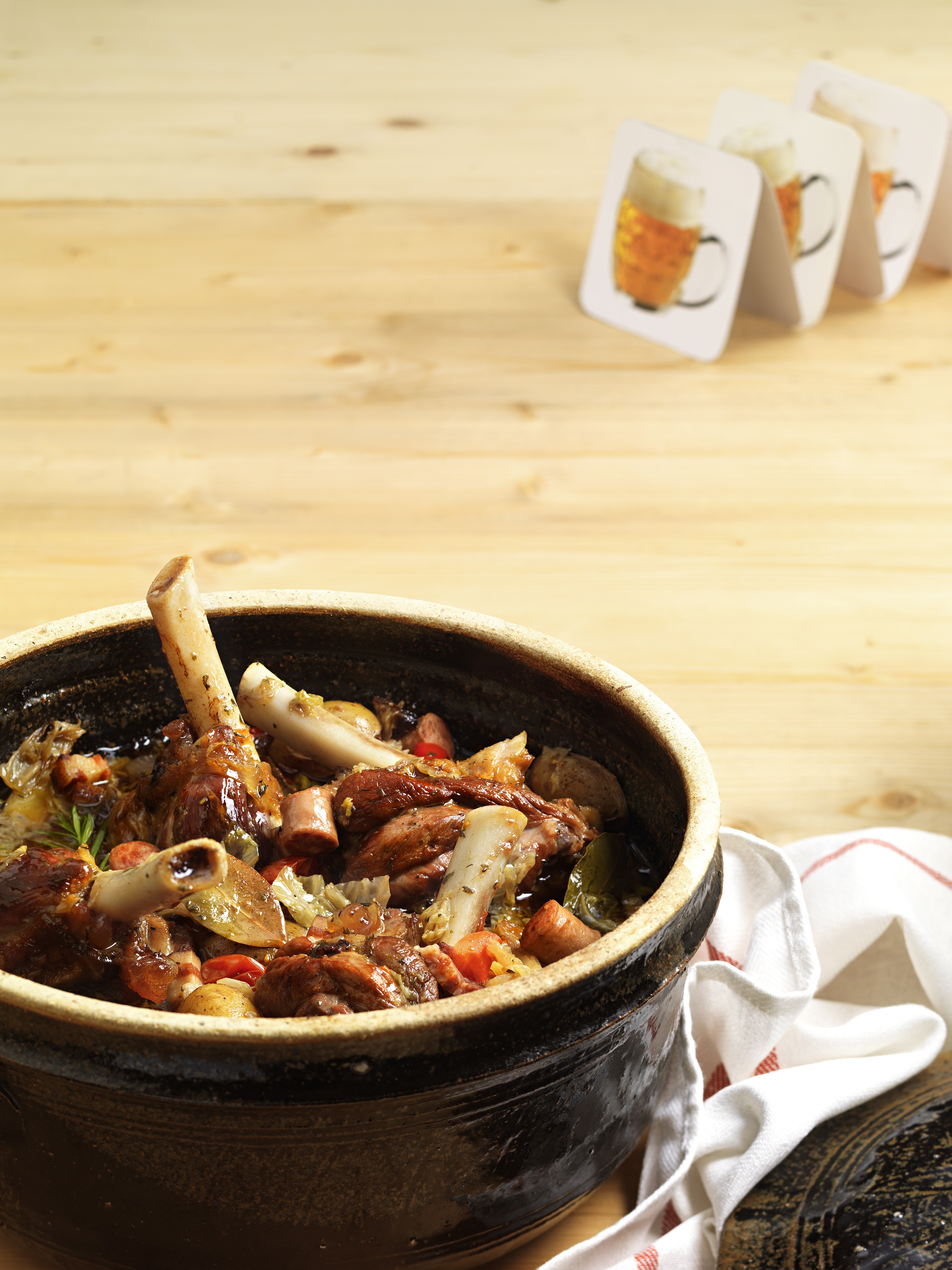 Kohl, Erdäpfel, Paprika, Zwiebeln, Wurst, Speck und Paradeiser in einen Schmortopf geben, mit Thymian, Kümmel und Lorbeerblättern vermischen. Stelzen in den Topf setzten, mit Bier übergießen, zudecken und im Rohr (untere Schiene / Gitterrost) ca. 90 Minuten schmoren; das Fleisch soll so weich sein, dass es sich leicht vom Knochen löst. 20 Minuten vor Ende der Garzeit Deckel entfernen, damit das Fleisch Farbe bekommt.