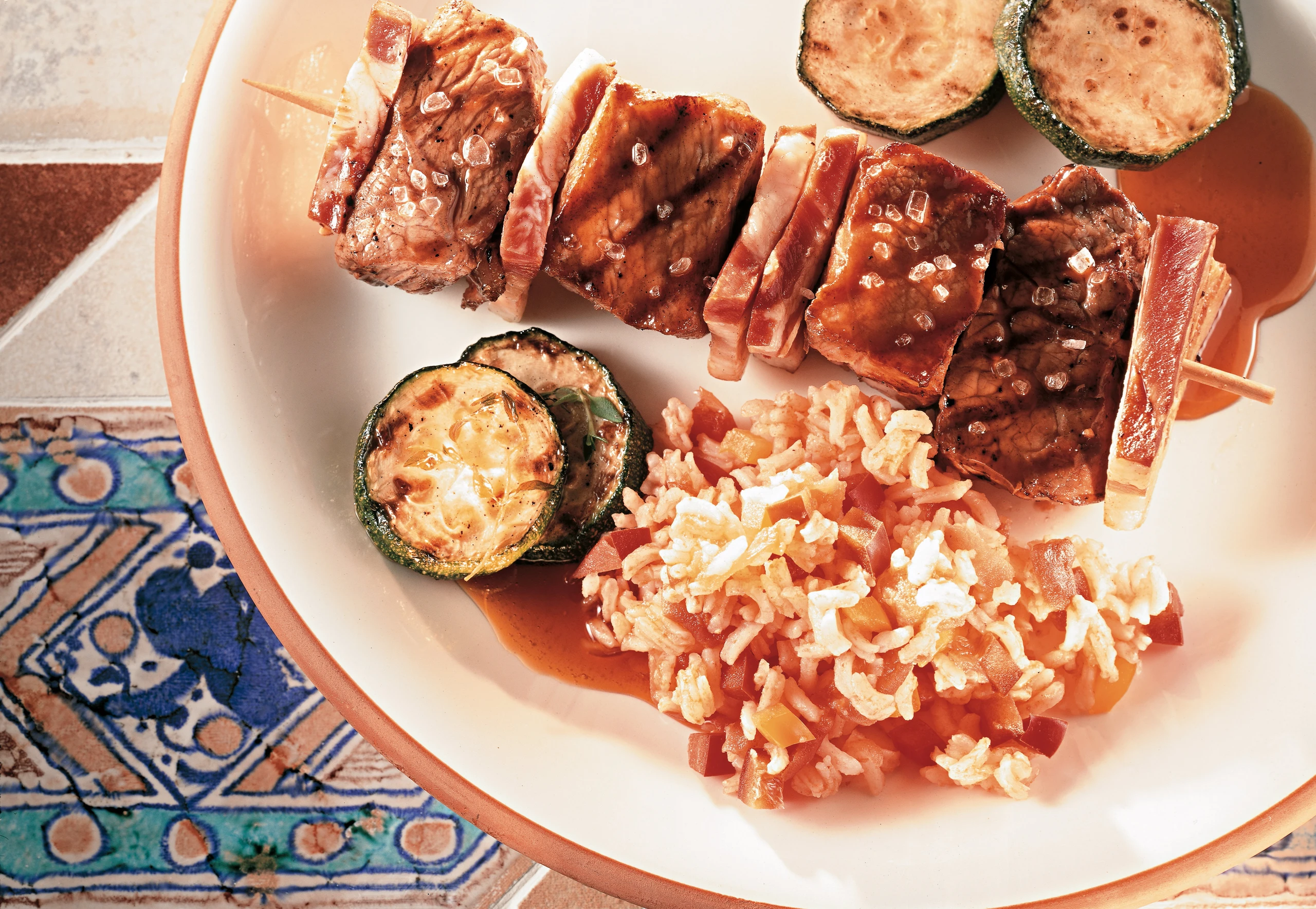 Speck in gleichbreite Streifen schneiden. Lamm- und Schweinefleisch in je acht gleichgroße Stücke (ca. 50 g) schneiden und abwechselnd mit dem Speck auf Spieße stecken. Spieße salzen, pfeffern, mit Olivenöl bestreichen und beidseitig grillen. Spieße vor dem Anrichten mit Meersalz und fein gehacktem Rosmarin bestreuen.