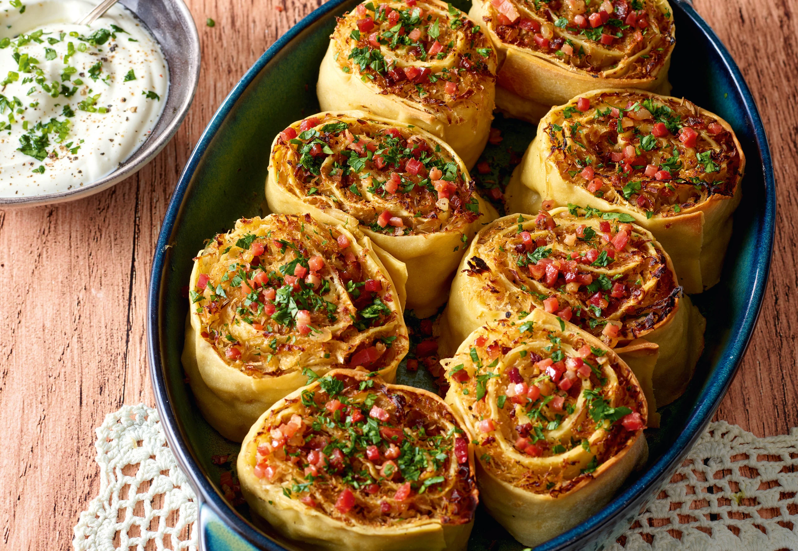 Sauerkraut darauf verteilen, sodass ein 1 cm breiter Rand frei bleibt. Teigränder mit Wasser bestreichen und von der kürzeren Seite locker einrollen. Rand fest andrücken.