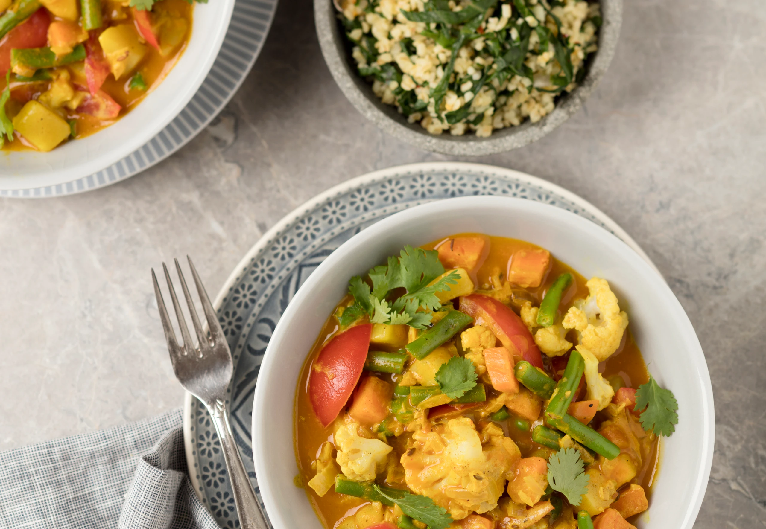 Gemüse und Kokosmilch zugeben und 8 Minuten dünsten. Gegen Ende der Garzeit Paradeiser zugeben. Curry mit Koriander verfeinern.