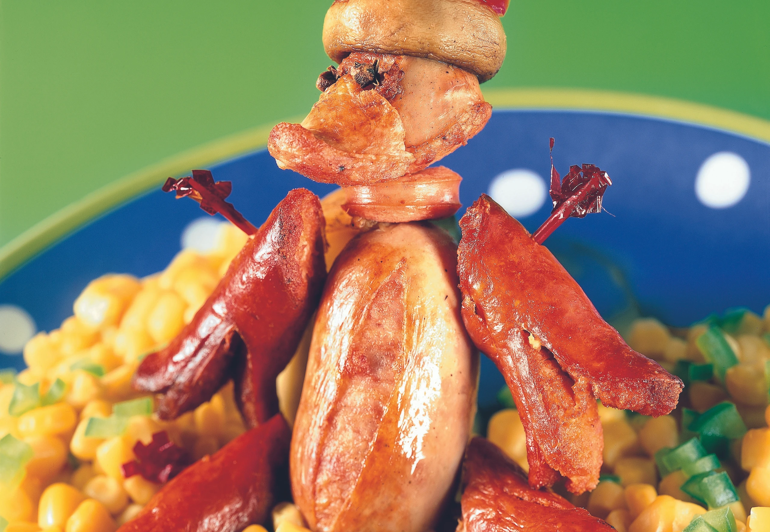 Wurst-Donald auf Kukuruzgemüse