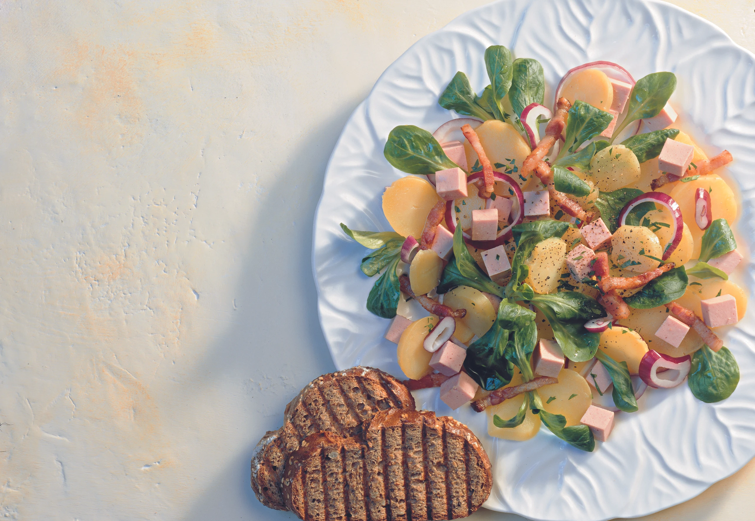 Speckstreifen und Vogerlsalat knapp vor dem Anrichten unter den Salat mischen. Zum Wurstsalat serviert man am besten getoastetes Schwarzbrot.
