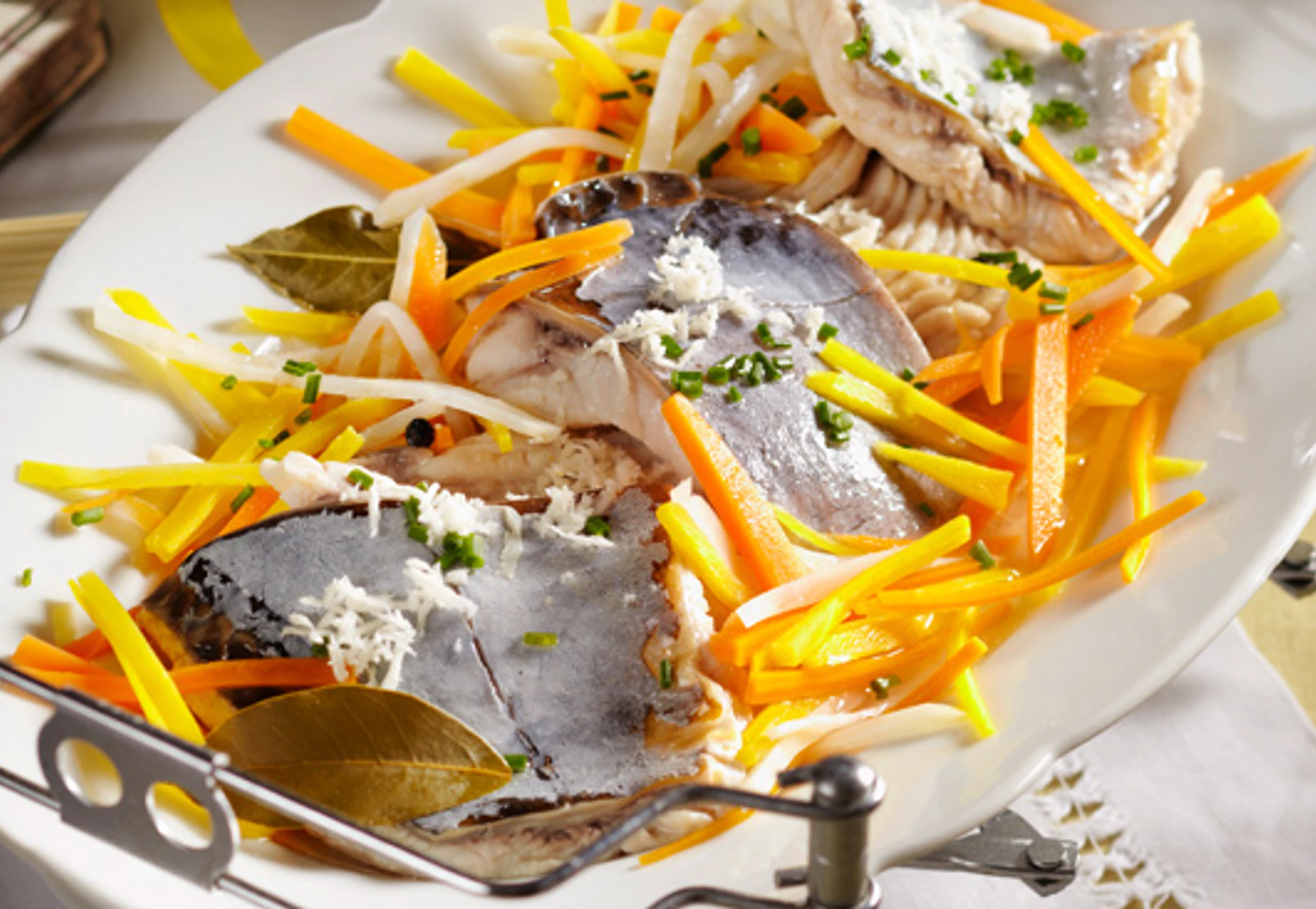 Karpfenstücke behutsam aus dem Fond heben und mit dem Gemüse anrichten. Karpfen mit Kren und Schnittlauch bestreut servieren. Als Beilage passen Petersilerdäpfel.