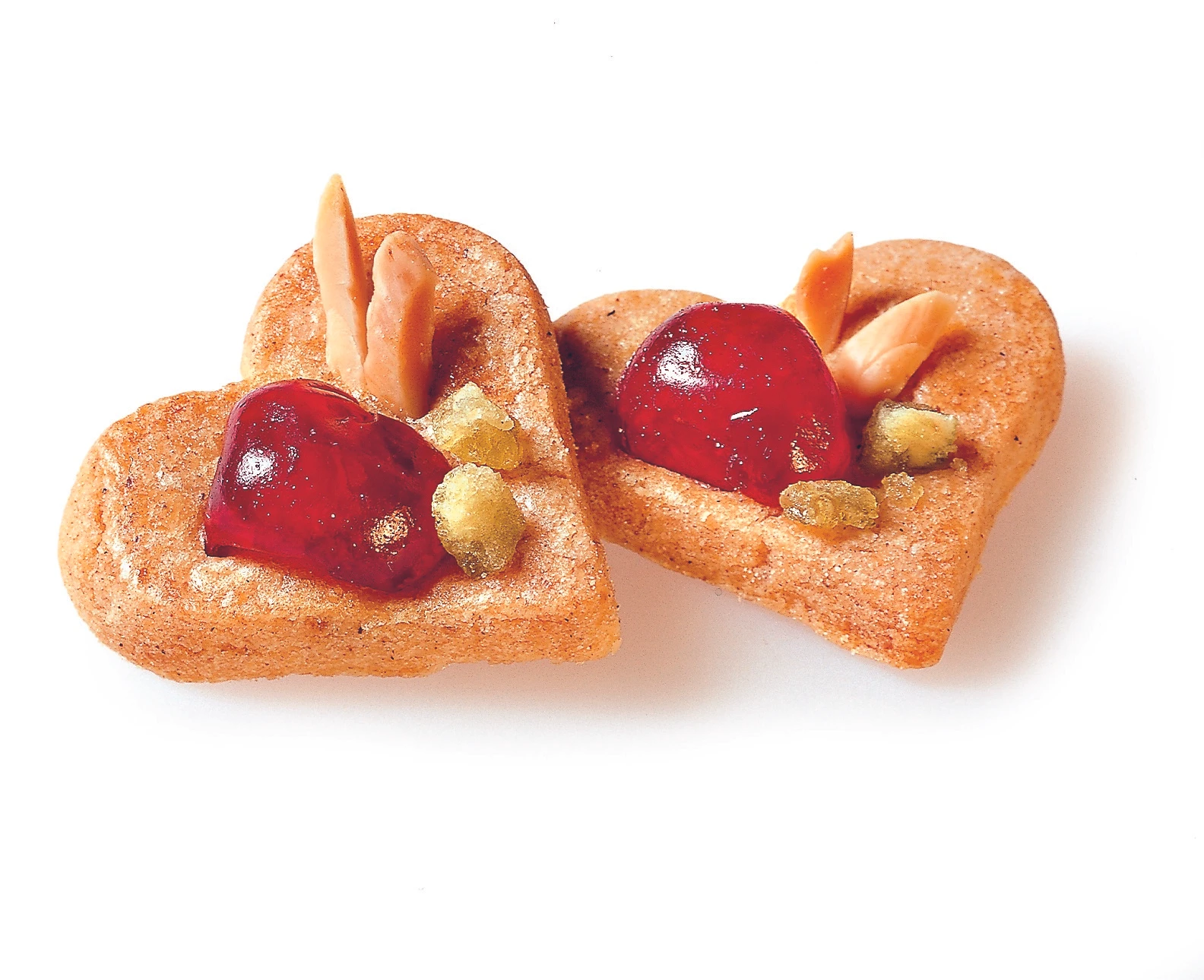 Teig 2–3 mm dick ausrollen, Herzen (Ø 4 cm) ausstechen, auf die Bleche legen, mit Eiklar bestreichen und mit Kirschen, Mandeln und Angelika garnieren. Herzen im Rohr (mittlere Schiene) ca. 15 Minuten goldgelb backen.