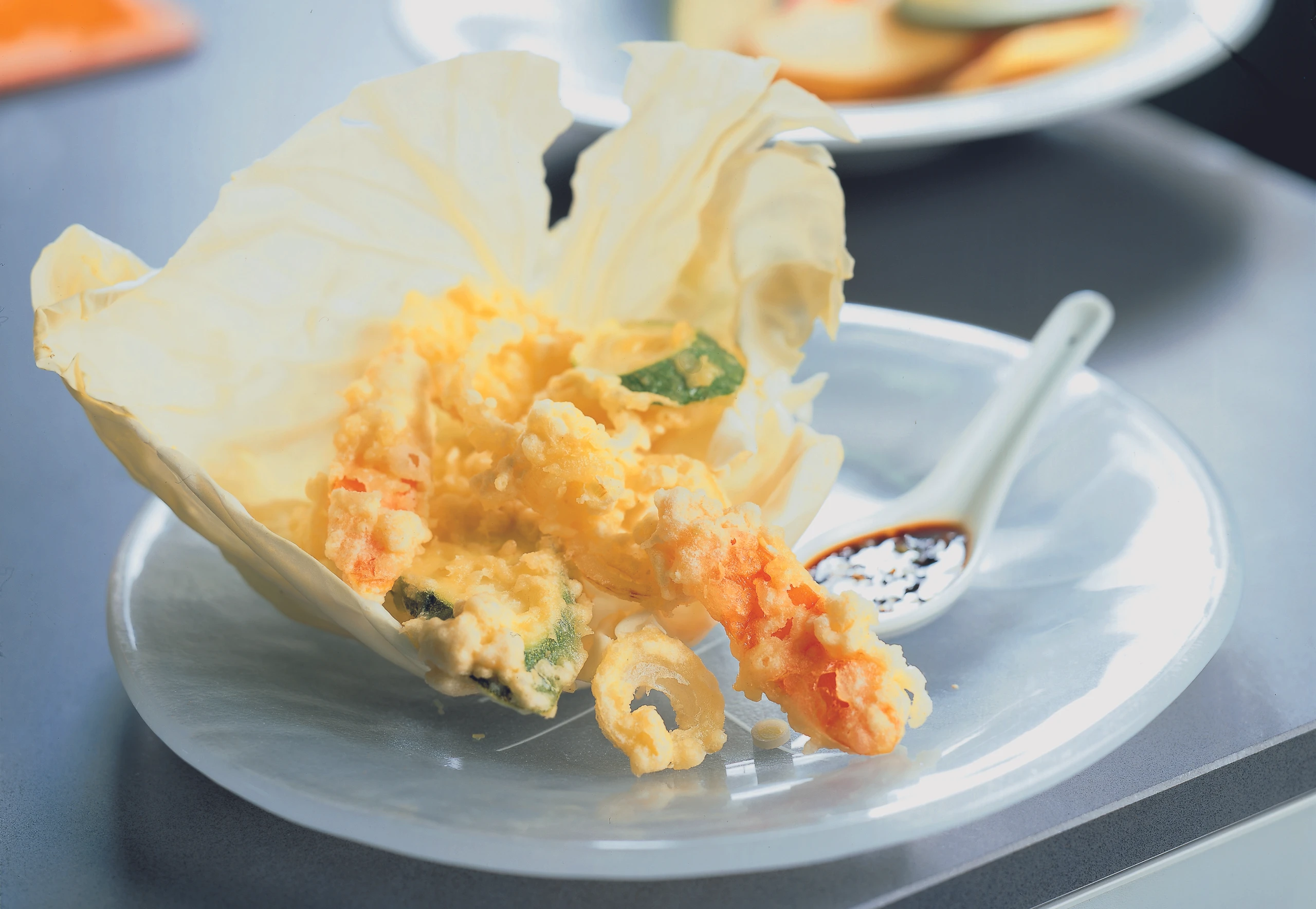 Tempura-Gemüse dekorativ anrichten, etwa auf einem Krautblatt. Dazu serviert am besten Sukiyakisauce.