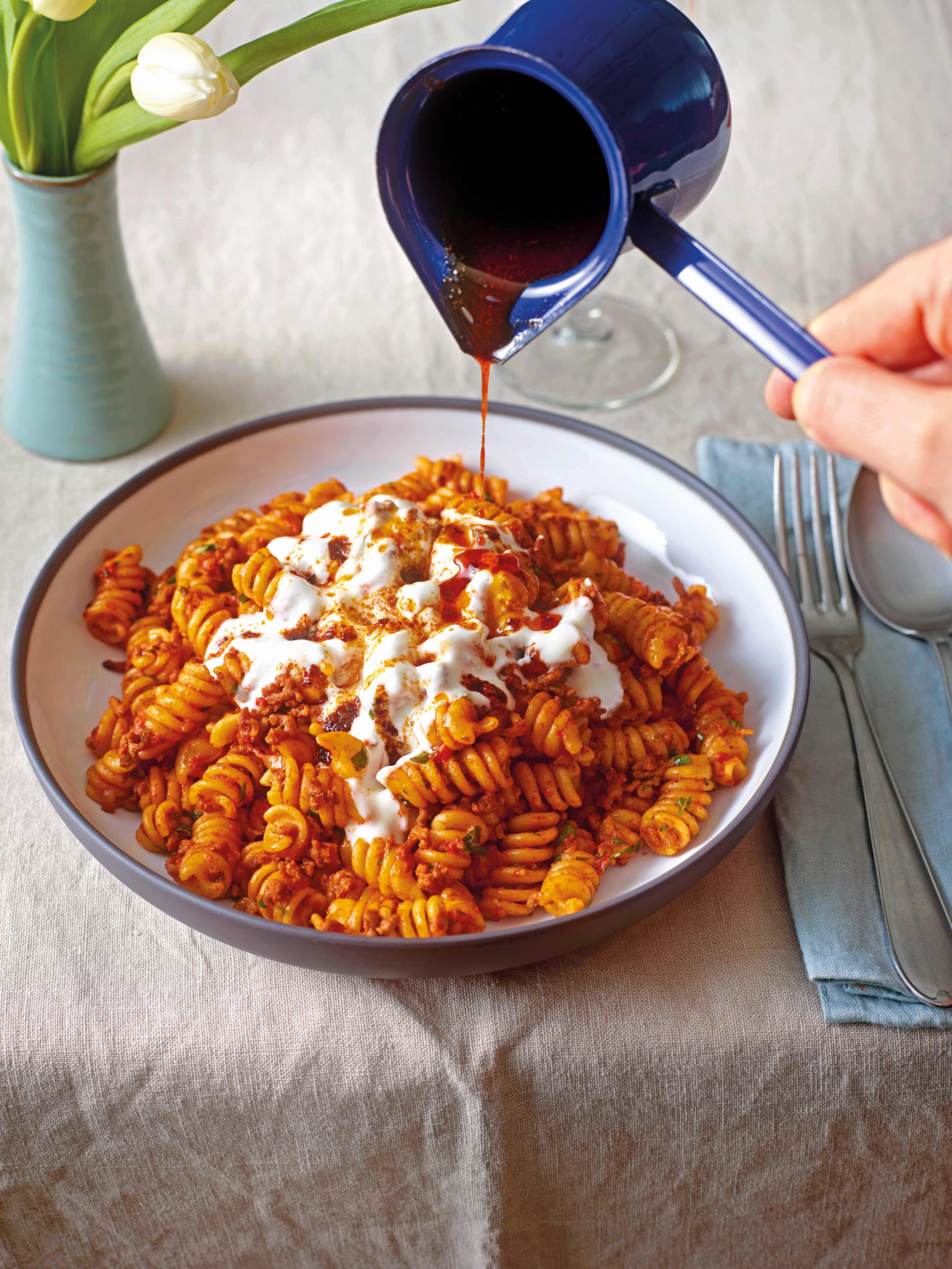 Yogurtlu Eriste - Türkische Nudeln mit Joghurt und Chiliguss
