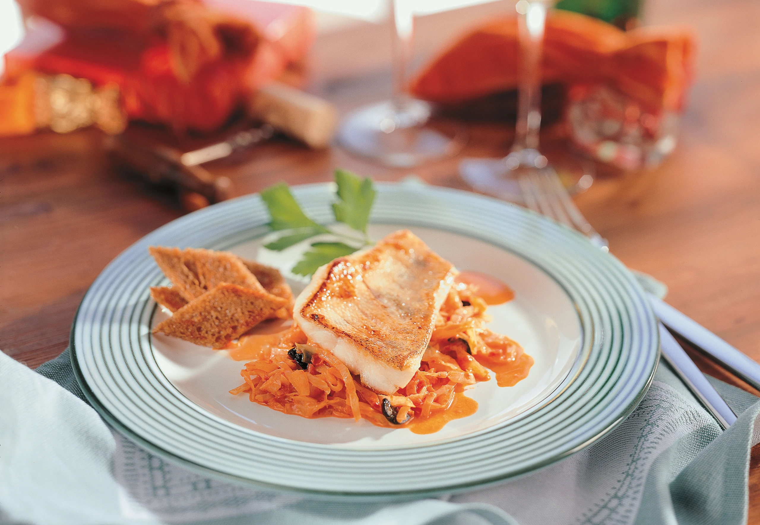 Zander auf Paprika-Olivenkraut mit Brotecken