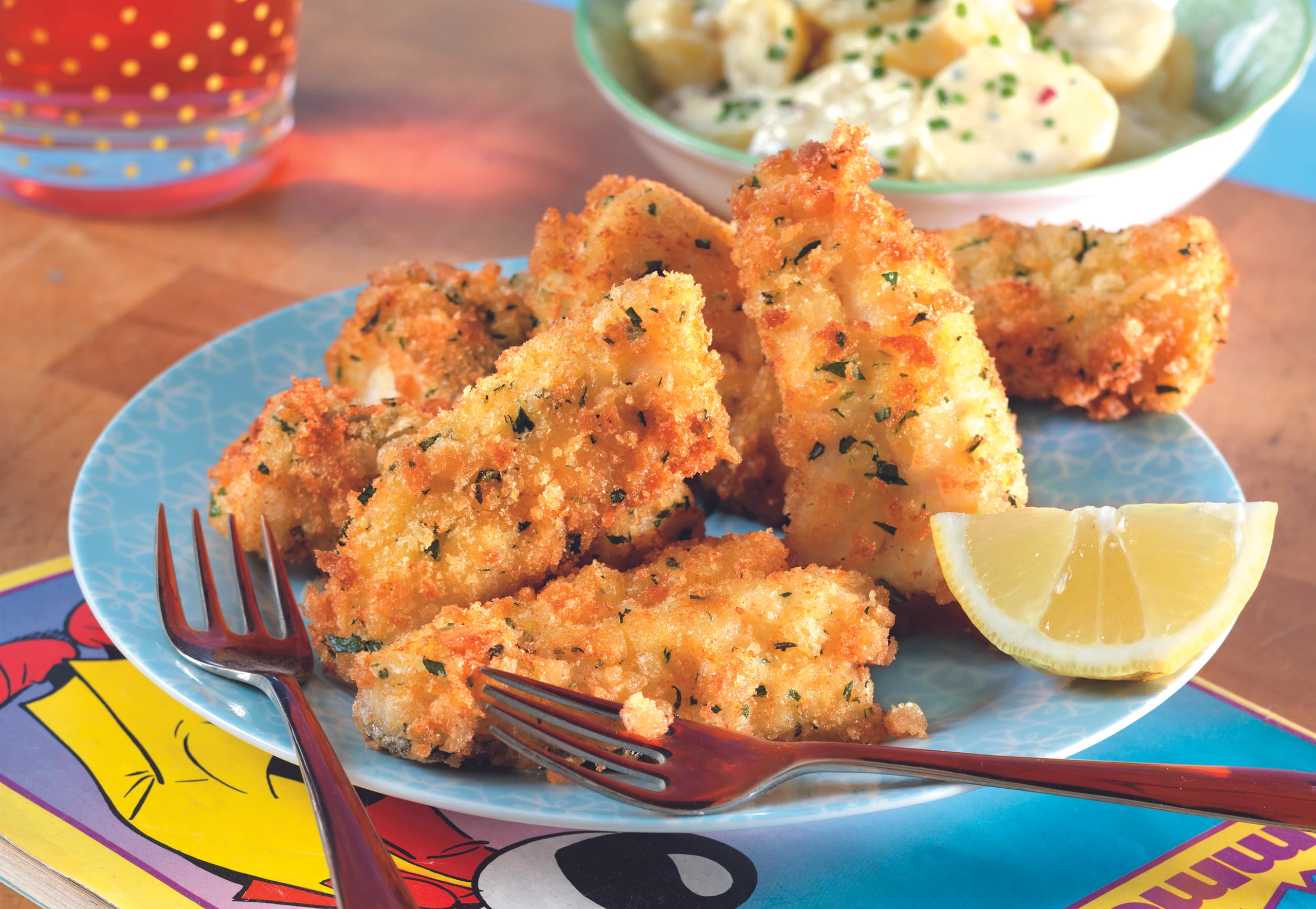- Semmeln entrinden, nicht zu fein reiben und mit den Kräutern mischen. Zanderfilets in ca. 3 x 5 cm große Stücke schneiden, mit Salz und Pfeffer würzen. Fischstücke in Mehl, Ei und den Kräuterbröseln panieren.