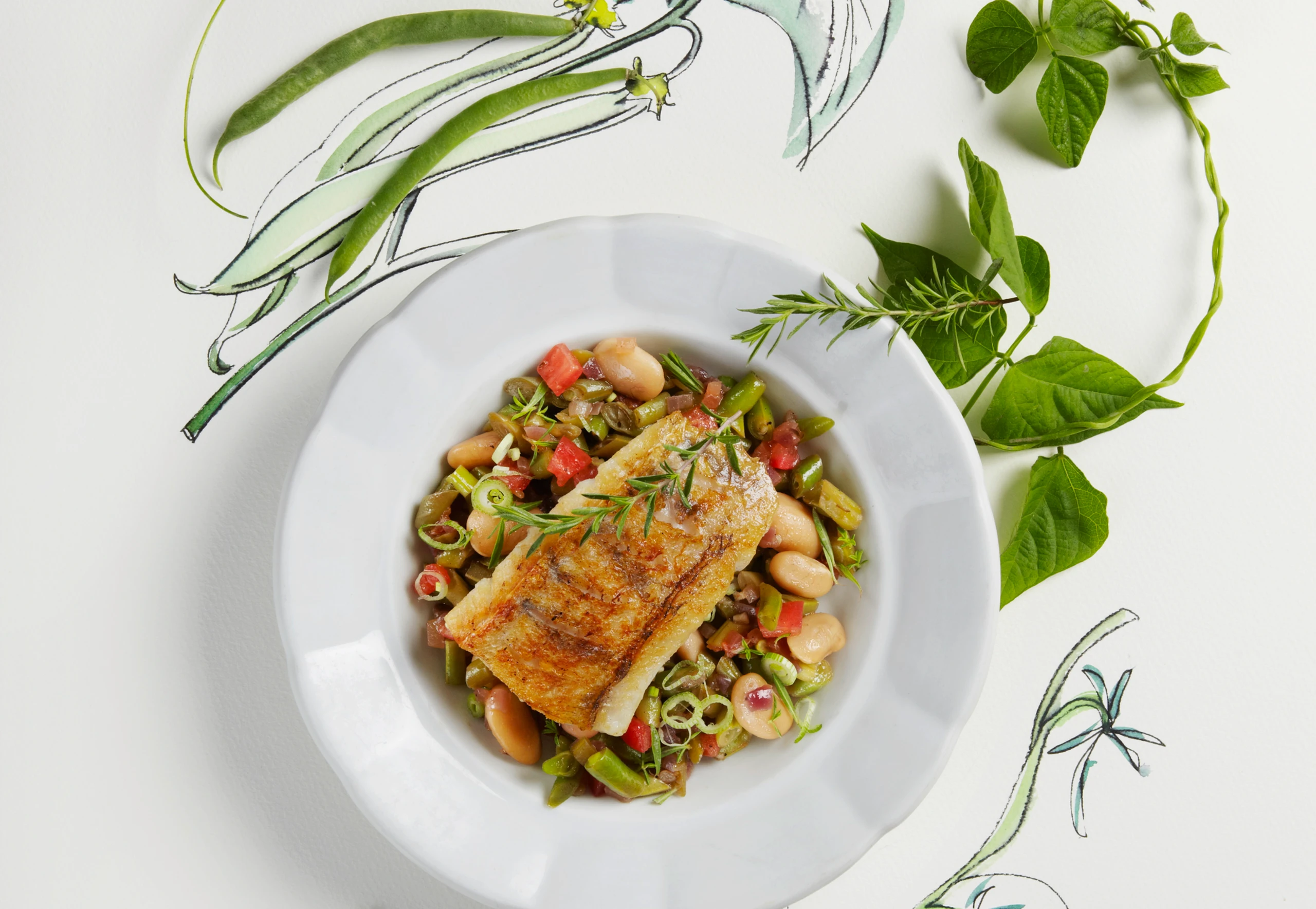 Zwiebel in 2 EL Öl anschwitzen, Fisolen zugeben und kurz mitbraten. Mit Suppe aufgießen und ca. 5 Minuten köcheln. Weiße Bohnen, Bohnenkraut und Paradeiser zugeben, mit Salz und Pfeffer würzen, Gemüse durch Einrühren der Butter binden.