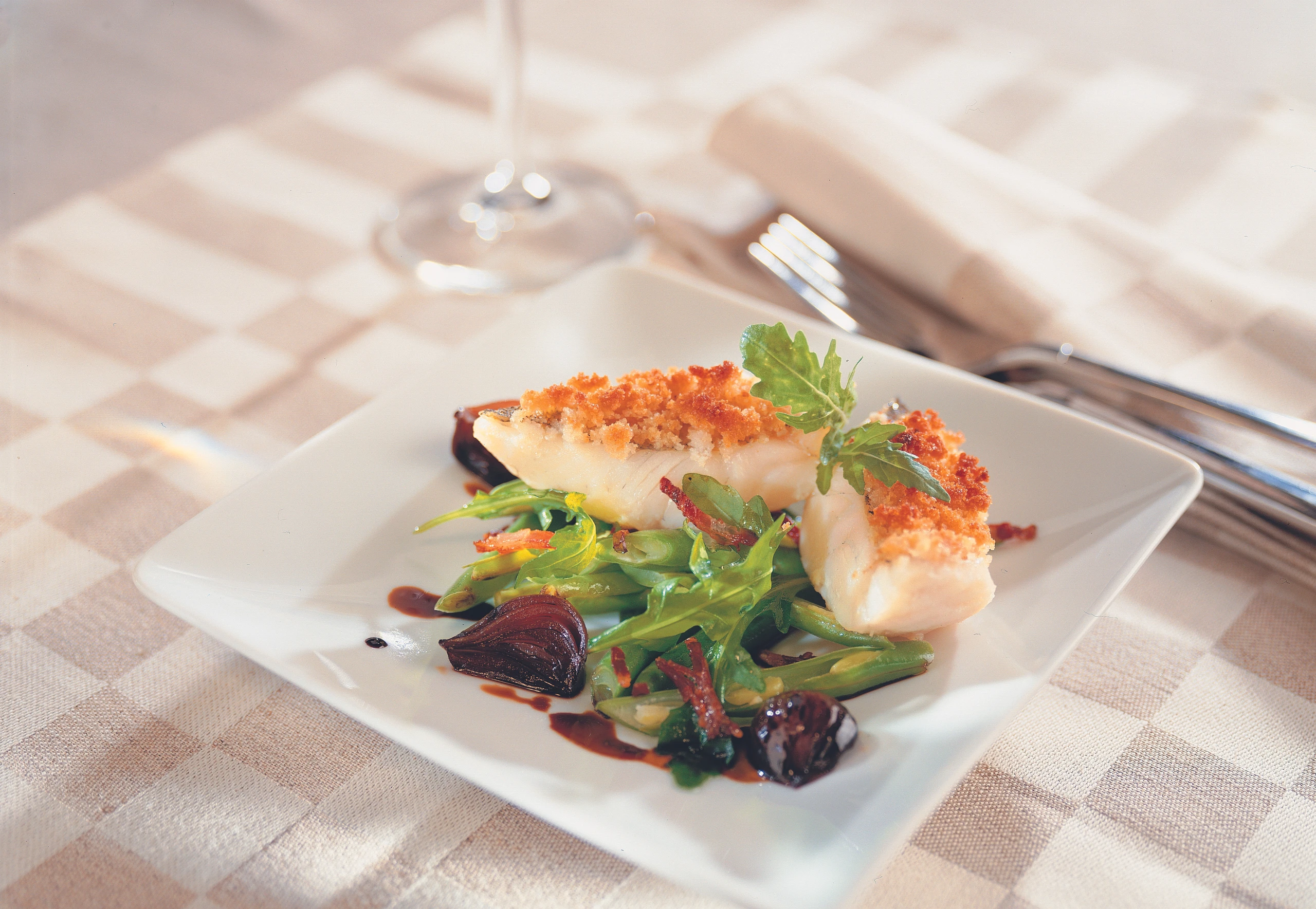 Schalotten mit Speckfisolen und Olivenöl vermischen. Zander mit Fisolensalat und Rucola anrichten.