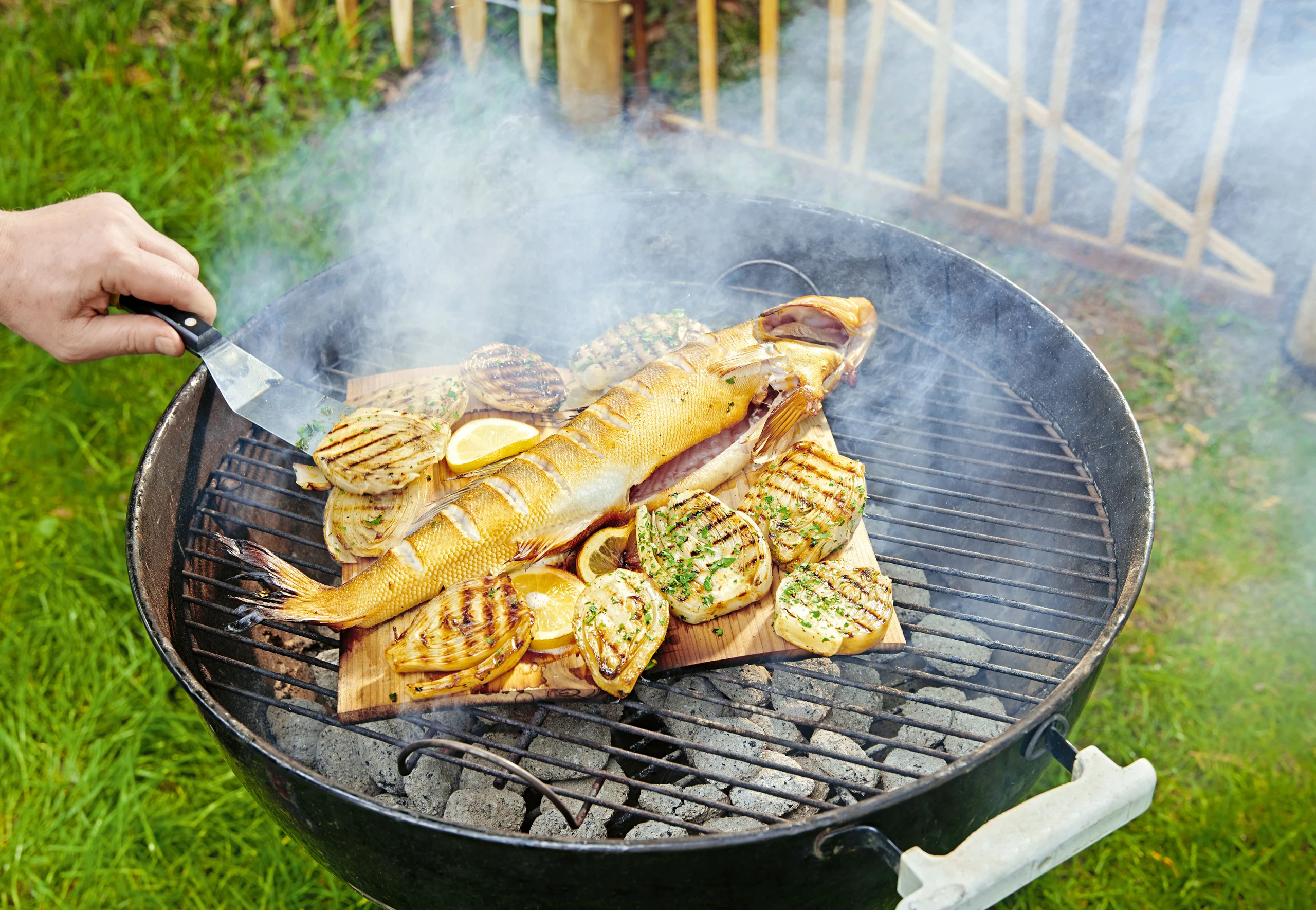 Bretter aus dem Wasser nehmen und auf den mittelheißen Grillrost legen. Zander und Zitronen auf die Bretter legen und zugedeckt ca. 25 Minuten grillen. Gegen Ende der Garzeit Fenchel dazulegen, mit Fenchelgrün und Petersilie bestreuen und mitgaren.