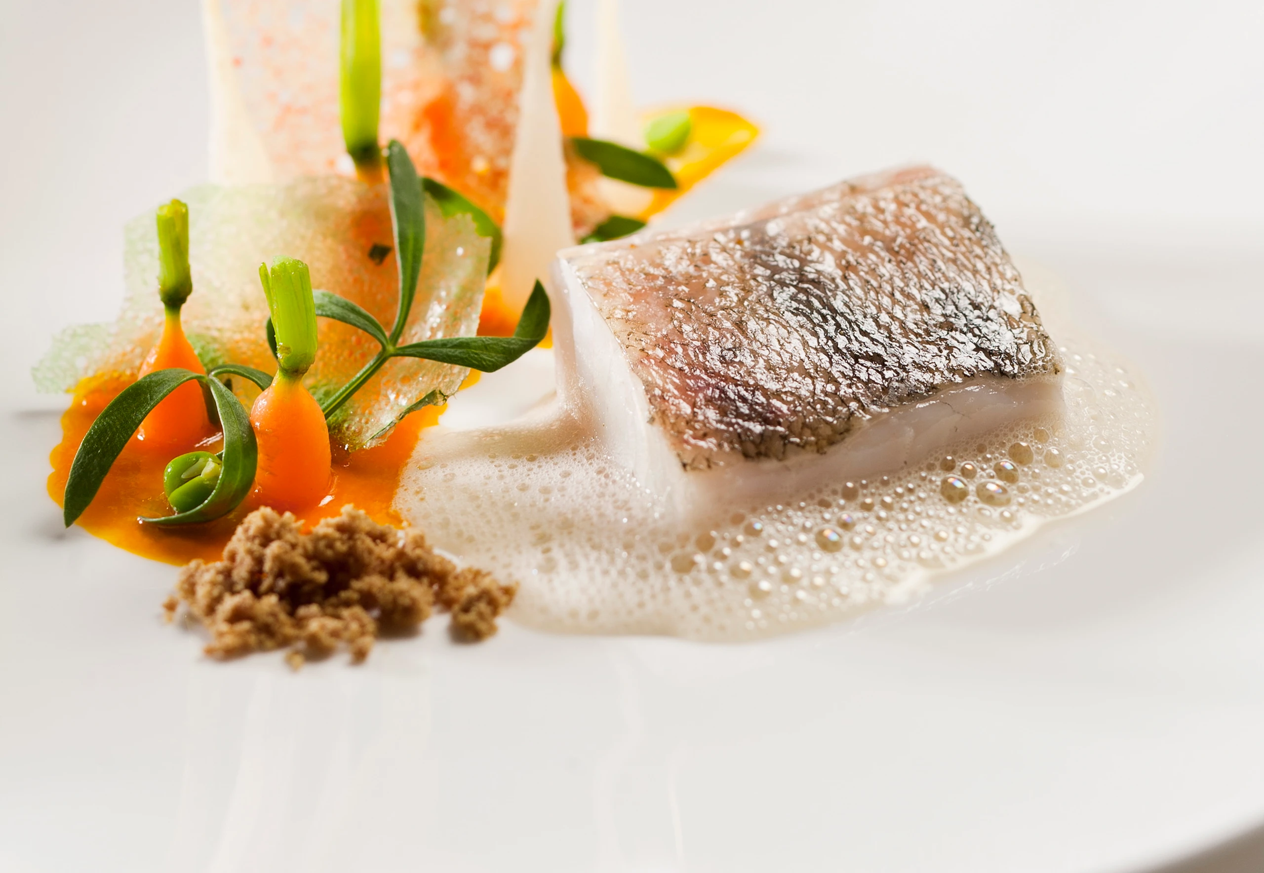 Zander auf der Fischsauce, Gemüse auf der Karottensauce anrichten, mit Meeresfenchel und Erdäpfelchips garnieren.