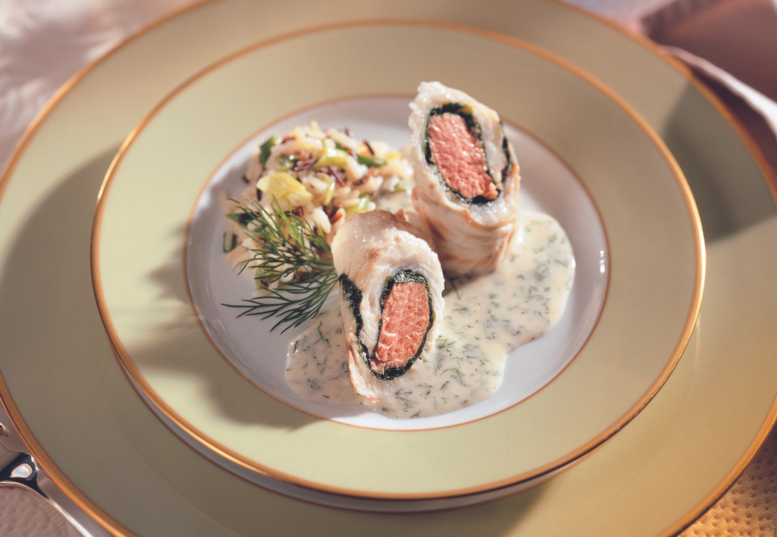 Pochierte Zander-Lachs-Röllchen mit Jungzwiebelreis