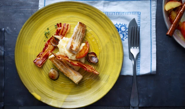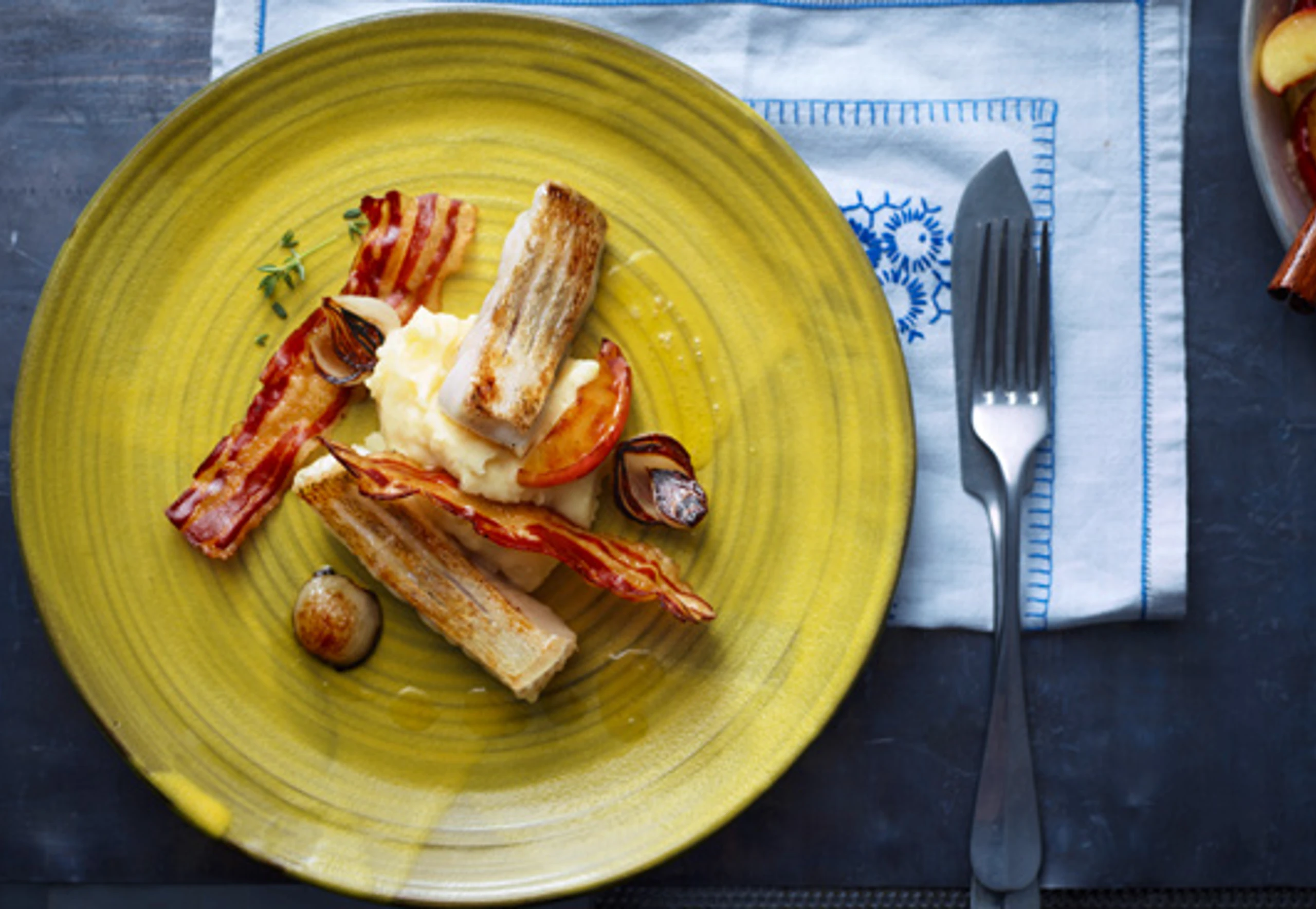 Zanderfilets auf dem Püree anrichten, mit Schalotten, Apfelspalten und Speckscheiben garniert servieren.
