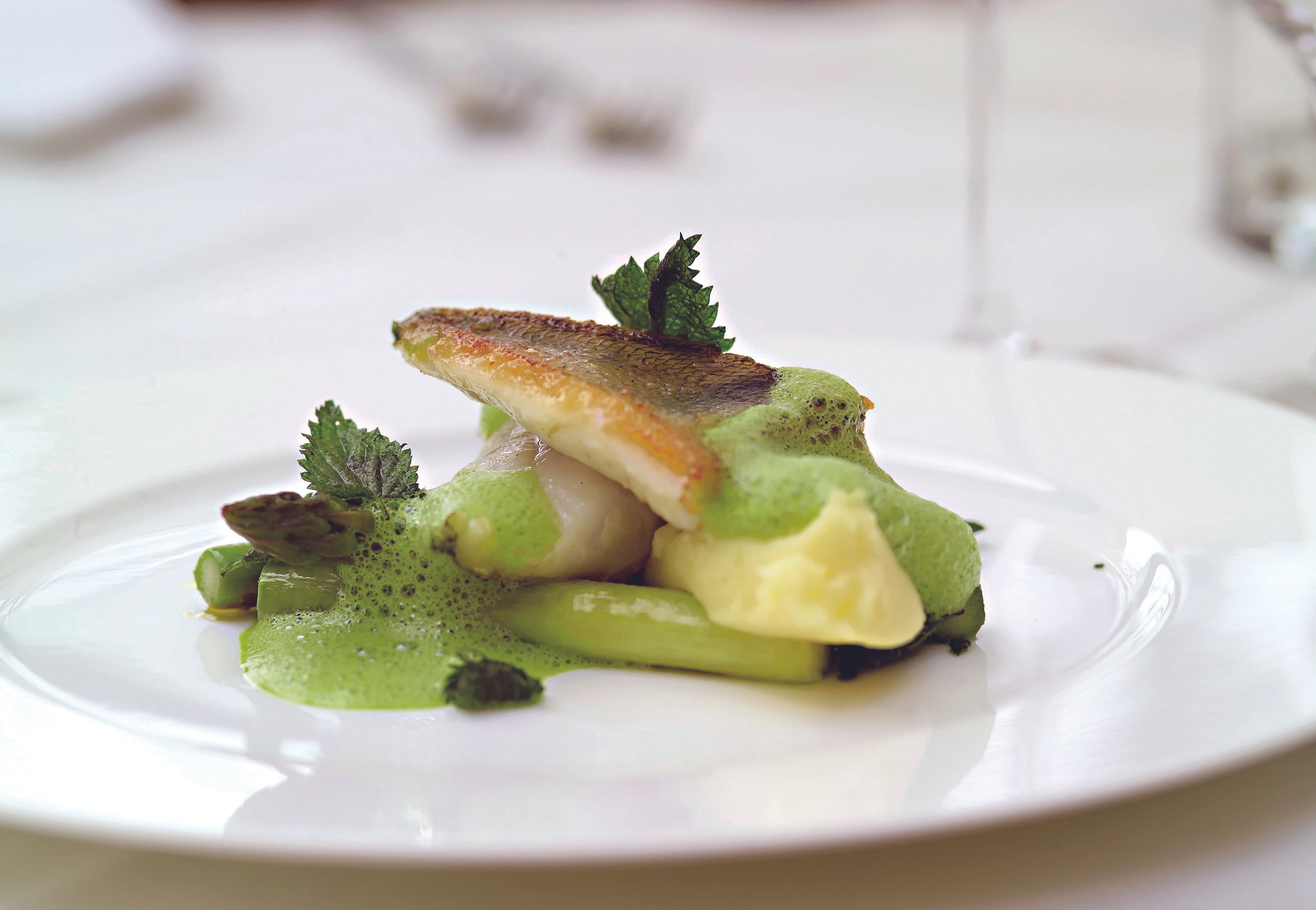 Fischfond auf die Hälfte einkochen. Fond etwas überkühlen lassen, kalte, in Stücke geschnittene Brennesselbutter zugeben, mit dem Stabmixer aufschäumen. Zanderfilets mit Brennnesselschaum, Erdäpfelpüree und grünem Spargel anrichten, mit frittierten Brennesselblättern garnieren.