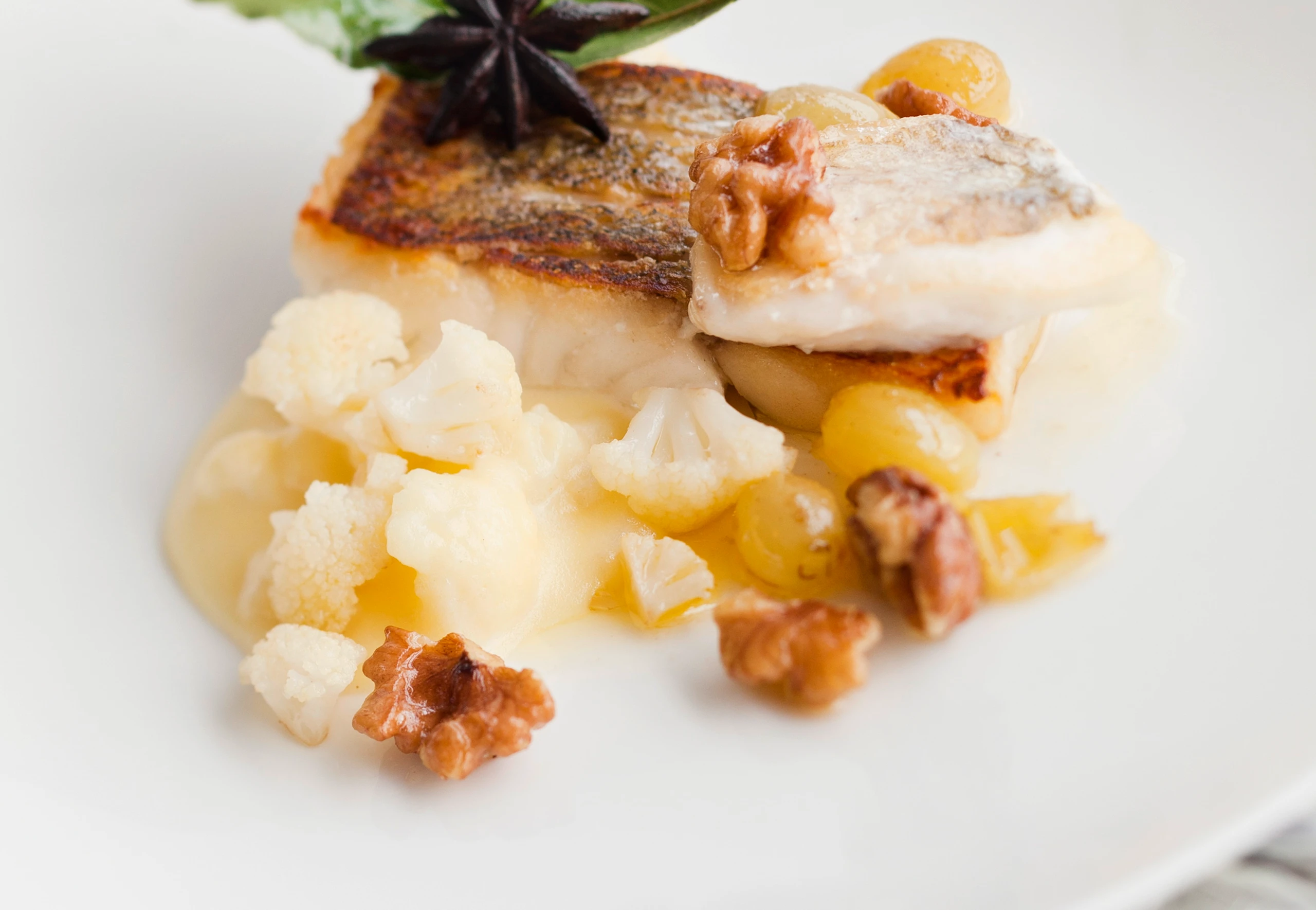 - Pfanne säubern, Nussöl darin erhitzen, Karfiolröschen, Trauben und Nüsse darin anschwitzen, mit Salz und Pfeffer würzen. Fischfilets mit Karfiolpüree und Garnitur anrichten, mit Lorbeer und Sternanis garniert servieren.