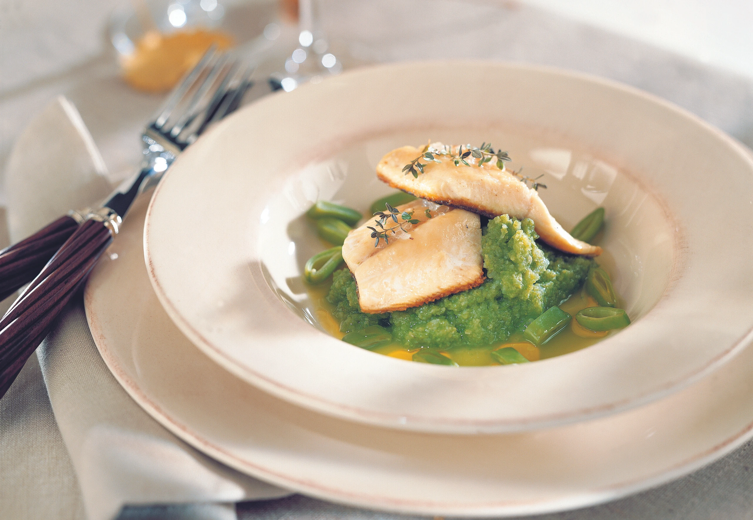 Filets in 8 Stücke schneiden, salzen, mit Thymian belegen und im Öl auf der Hautseite anbraten. Wenden, kurz weiterbraten, auf das Blech legen (Hautseite oben) und im Rohr ca. 5 Minuten garen.