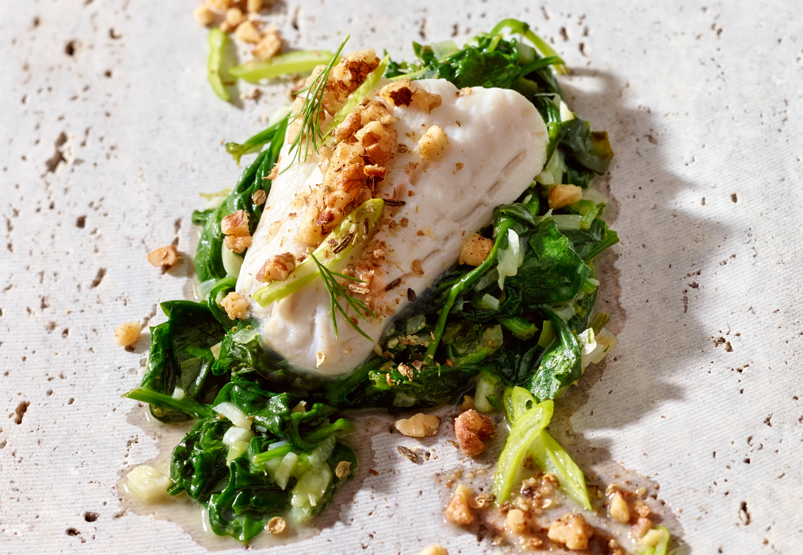 - Zanderfilet quer vierteln, auf der Hautseite in kurzen Abständen, nicht zu tief einschneiden, mit Salz und wenig Pfeffer würzen. Filets mit der Hautseite nach unten auf den Spinat legen und zugedeckt ca. 8 Minuten (je nach Dicke der Filets) dämpfen. Filets mit dem Spinat anrichten, mit Dukkah bestreuen und eventuell mit Dillzweigen garnieren.