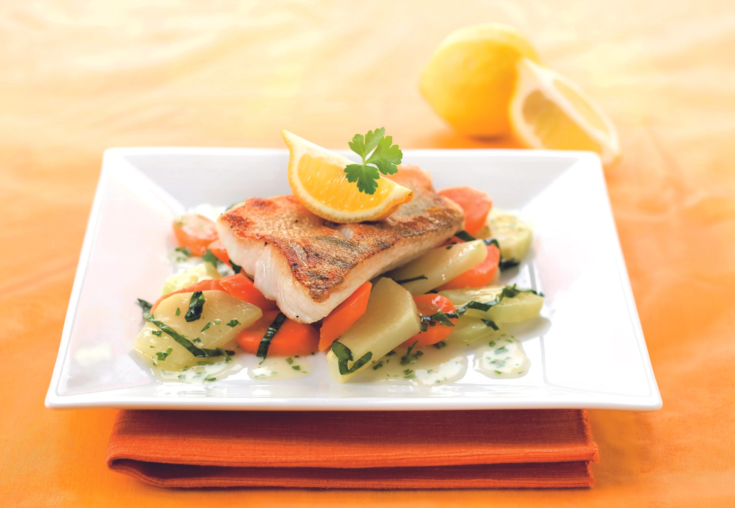 Bratrückstand mit Suppe aufgießen und aufkochen. Stärke mit 2 TL Wasser vermischen, in den Fond rühren und kurz mitköcheln. Petersilie untermischen. Fisch mit Gemüse und Fond anrichten