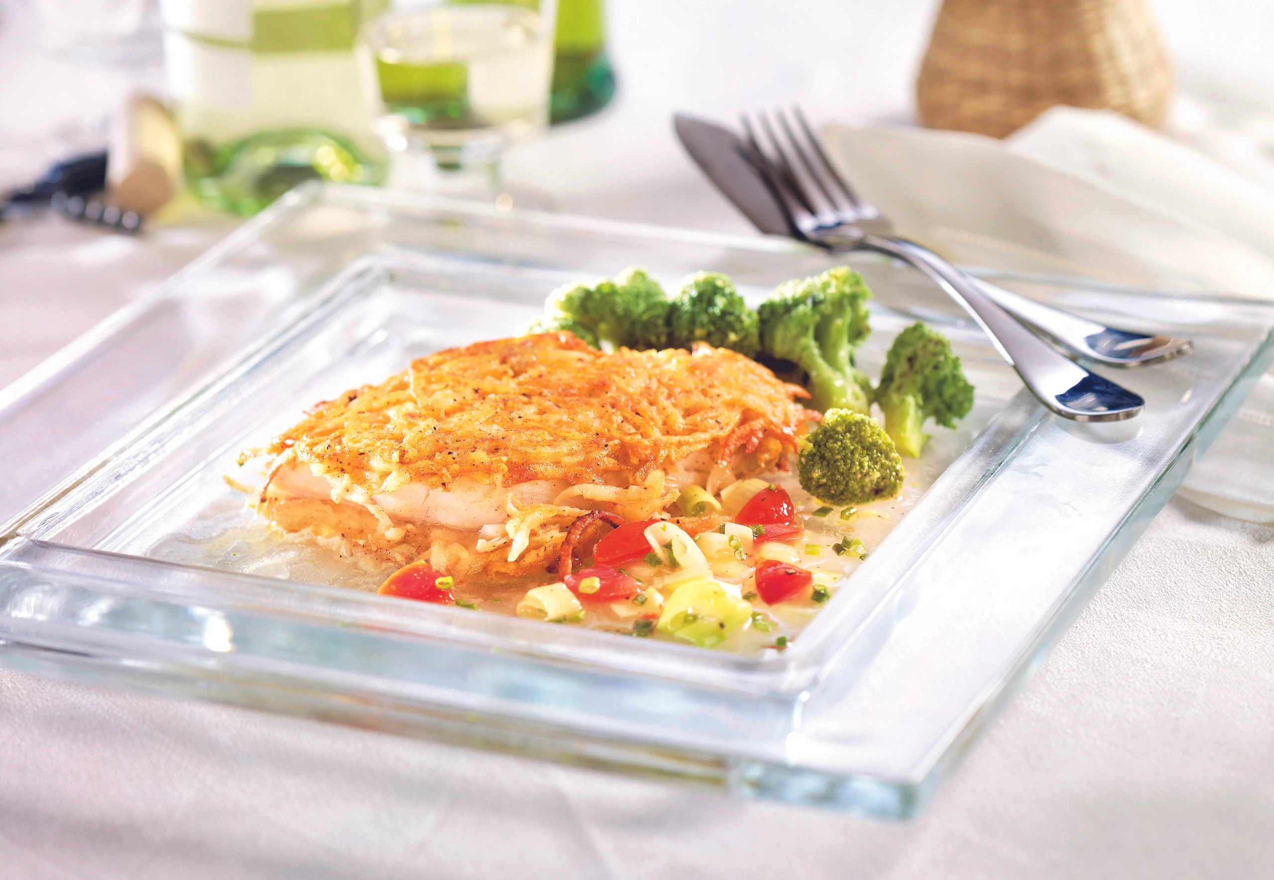 Filets halbieren, mit Salz, Pfeffer und Zitronensaft würzen. Filets so in die Erdäpfelmasse drücken, dass beidseitig eine cm dicke Schicht haften bleibt. Filets beidseitig in Öl braten, herausheben, auf Küchenpapier abtropfen lassen, mit Sauce und Broccoli anrichten.