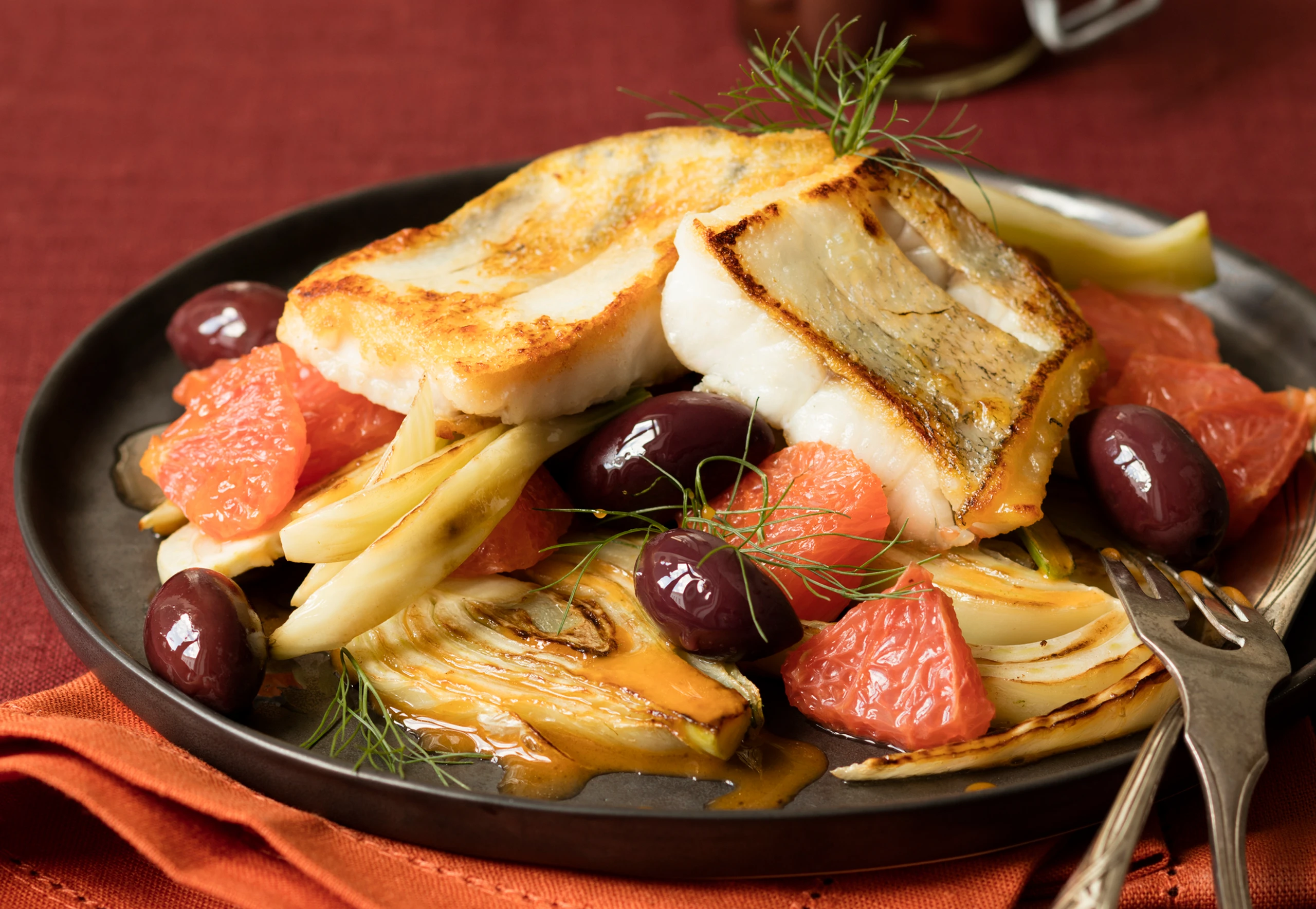 Im Bratrückstand Fenchel beidseitig braten, salzen, pfeffern und mit Grapefruitsaft aufgießen. Fenchel bissfest garen, Grapefruitscheiben und Oliven untermischen. Gemüse durch Einrühren der Butterstücke binden. Filets mit dem Gemüse anrichten und mit Fenchelgrün bestreuen.