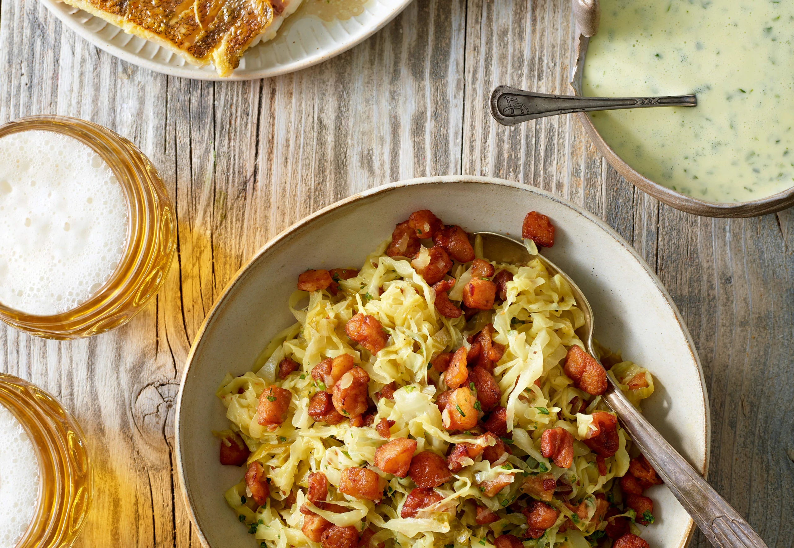 Zanderfilet mit Grammel-Bierkraut und Kräuterfond