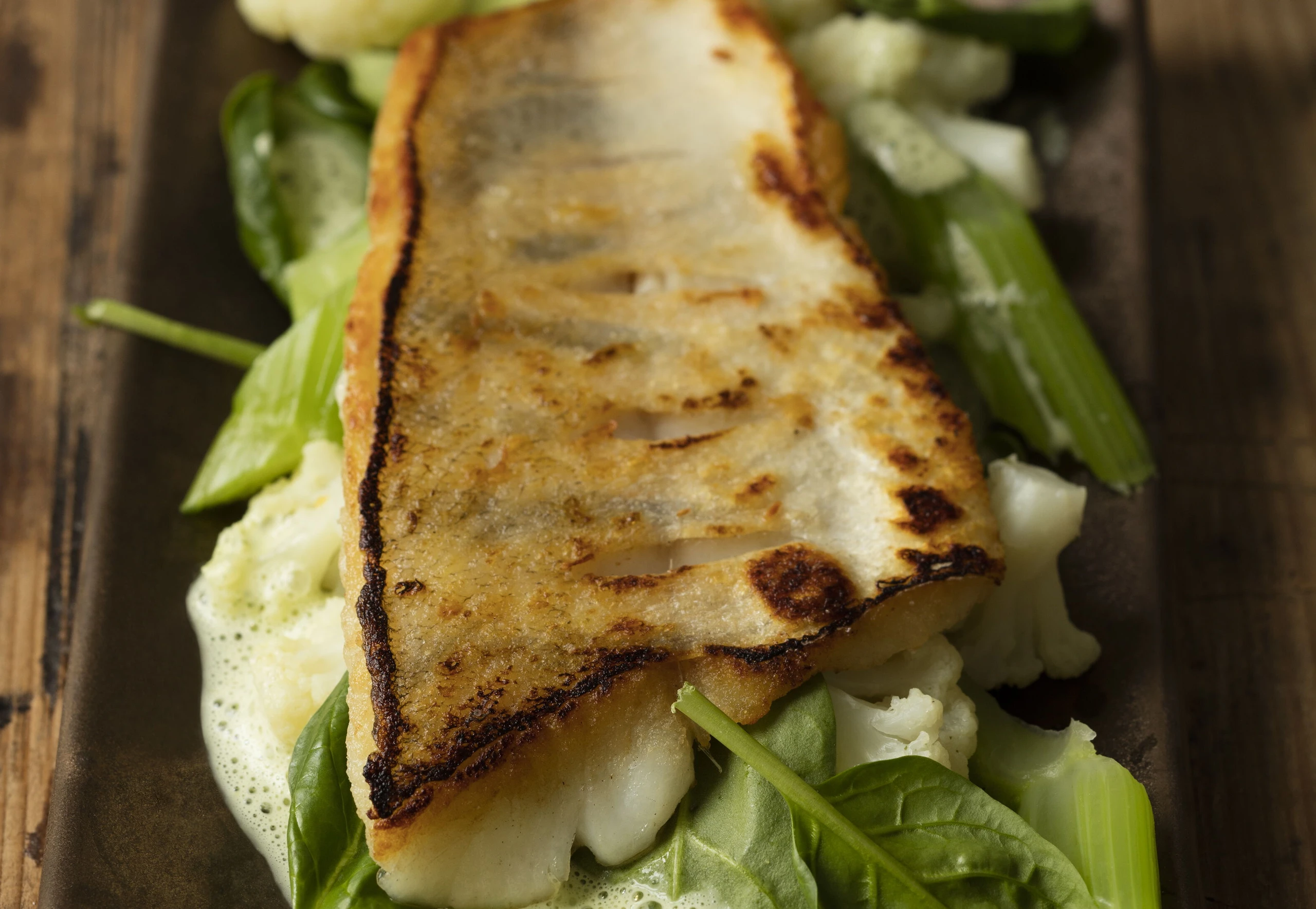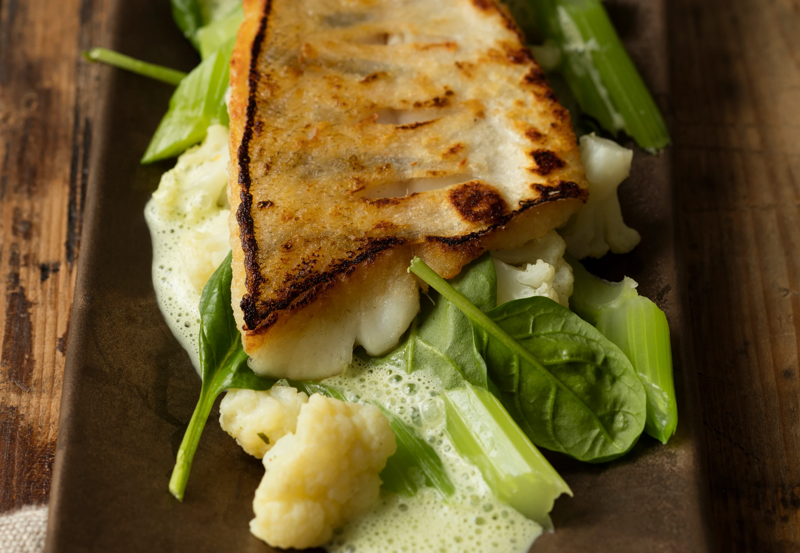 Filets auf der Hautseite quer einschneiden, salzen, pfeffern und in Öl beidseitig (Hautseite zuerst) braten. Gemüse in 1 EL Butter erwärmen, Spinat untermischen. Filets mit Gemüse und Sauce anrichten.