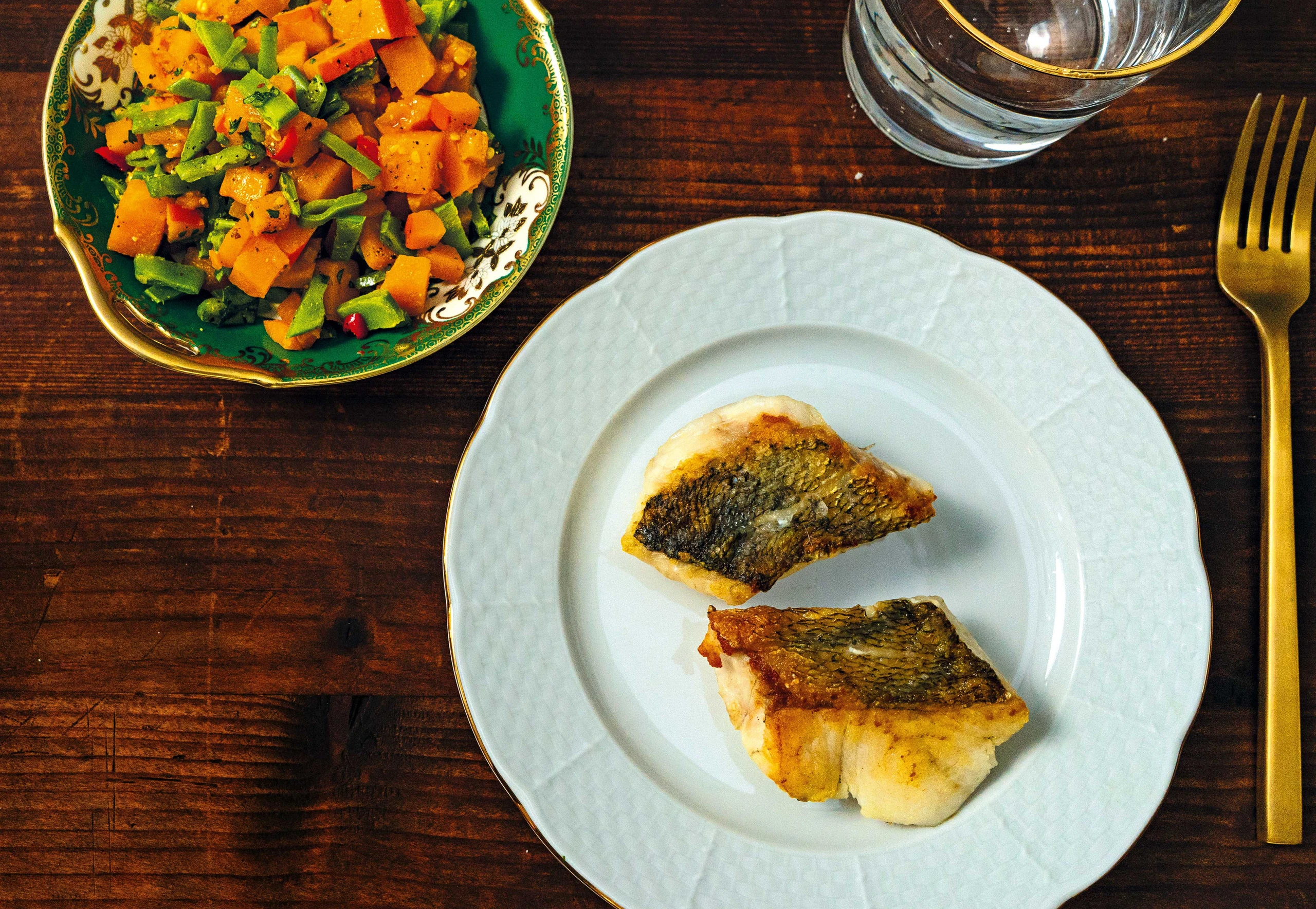 Zanderfilet mit Kürbis, Zuckerschoten und Chili