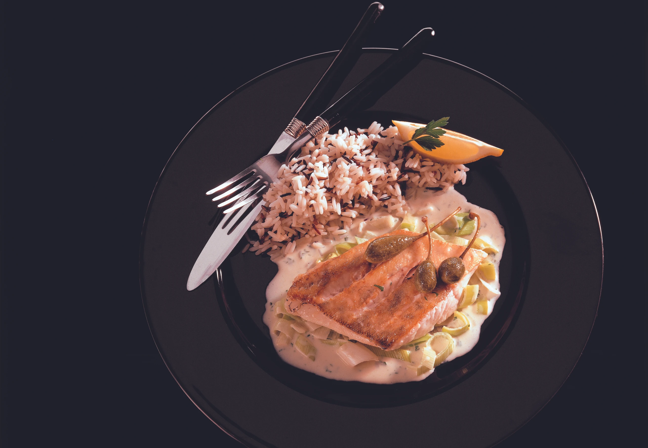 Im Bratrückstand Lauch anschwitzen, Suppe und Obers zugießen und die Sauce cremig einkochen (dauert ca. 1/2 Minute). Petersil einrühren. Fischfilets mit der Sauce, Kapernbeeren und dem vorher zubereiteten Reis (siehe Rezept) servieren.