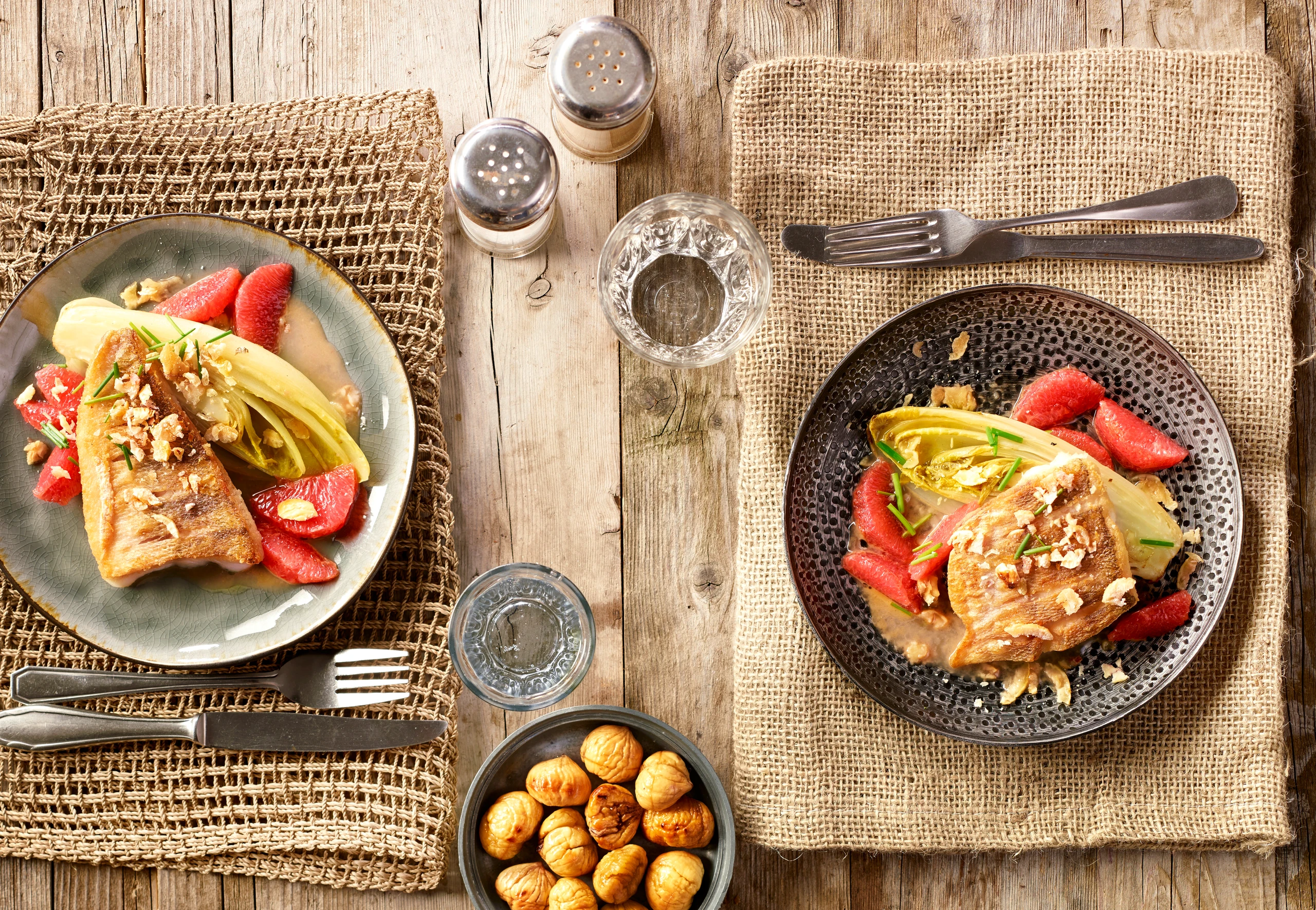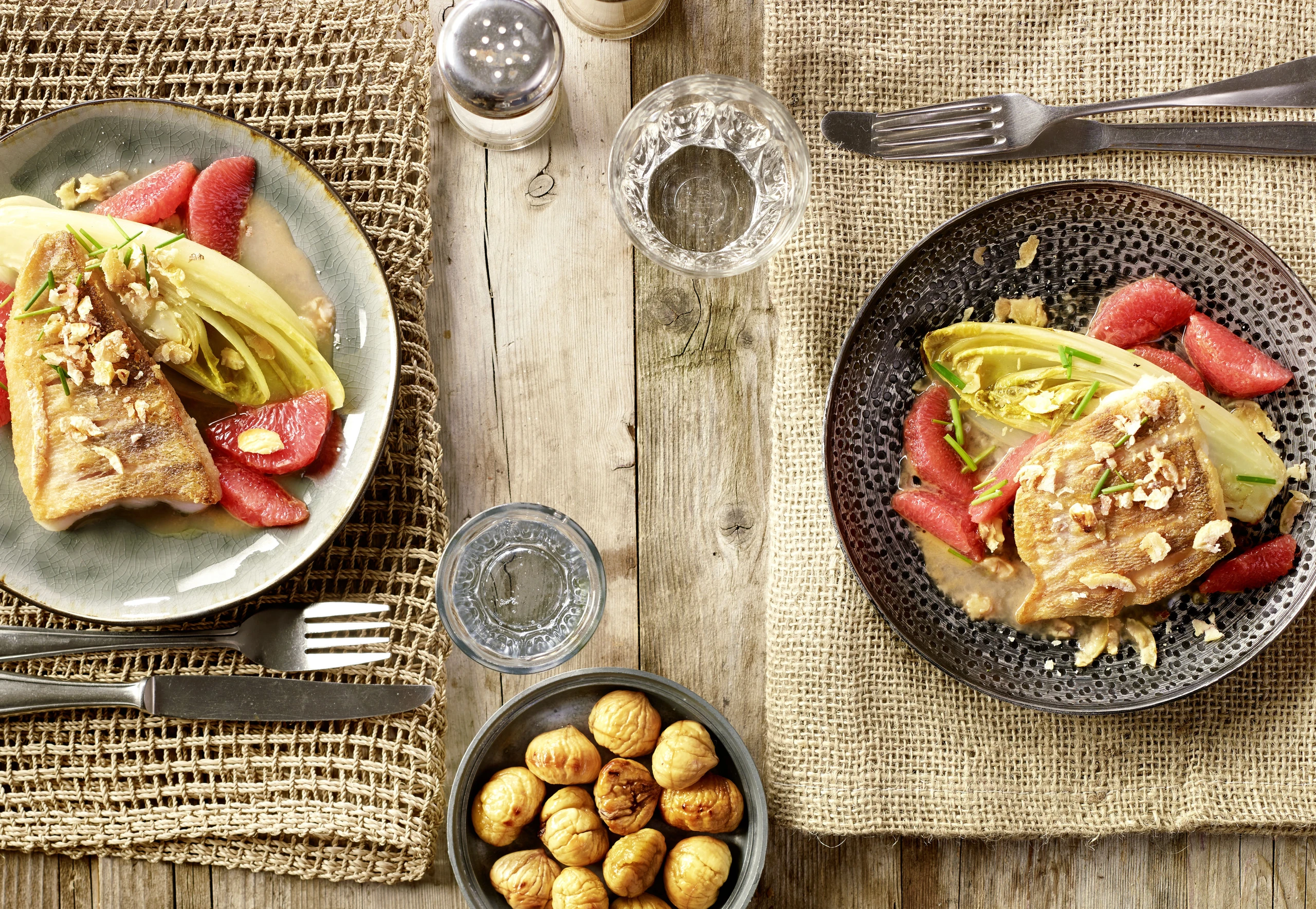Zanderfilet mit Maroni, Chicorée und Grapefruits