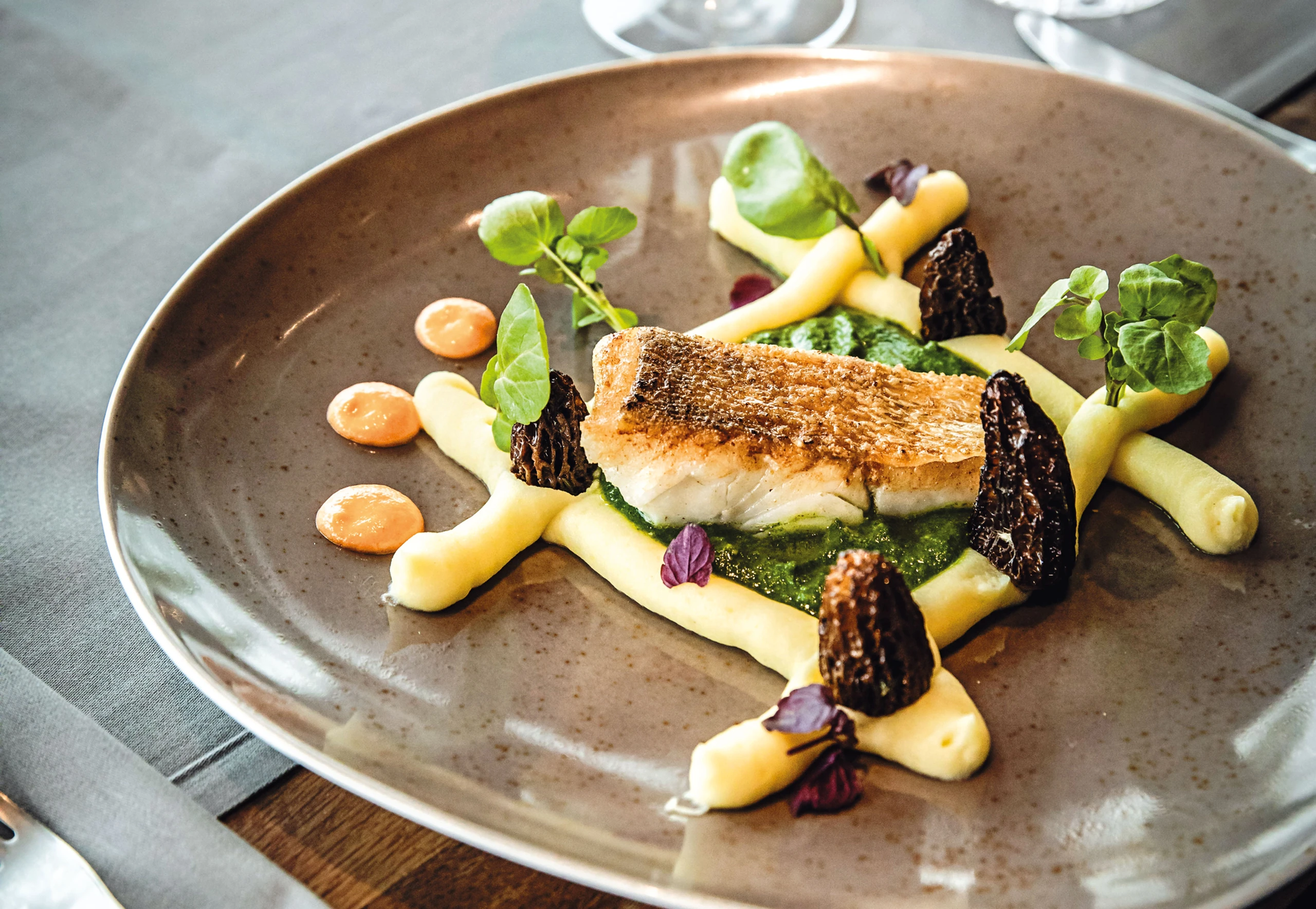 Erdäpfelpüree in einen Dressiersack (ohne Tülle) füllen und gitterförmig auf die Teller dressieren. Gitter mit Kresse-Spinatpüree füllen und mit Morcheln und Kresseblättchen garnieren. Filets darauf setzen und mit der Paprikasauce garniert servieren.