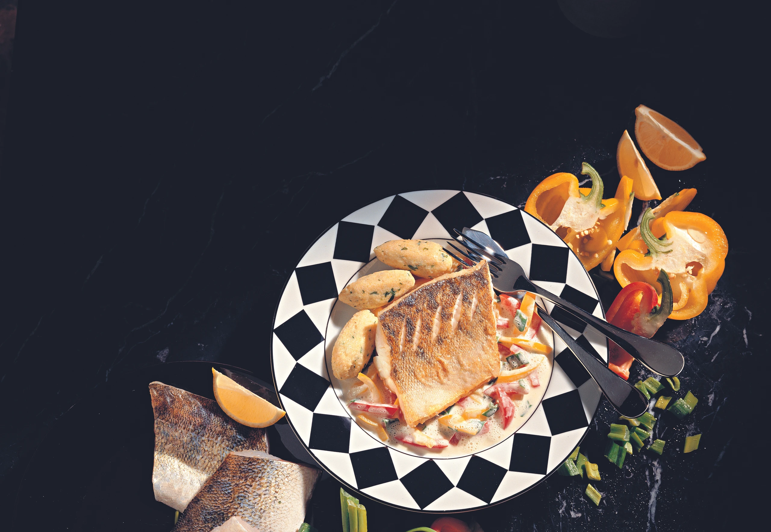 Zanderfilets mit Jungzwiebelsauce und Polentanockerln