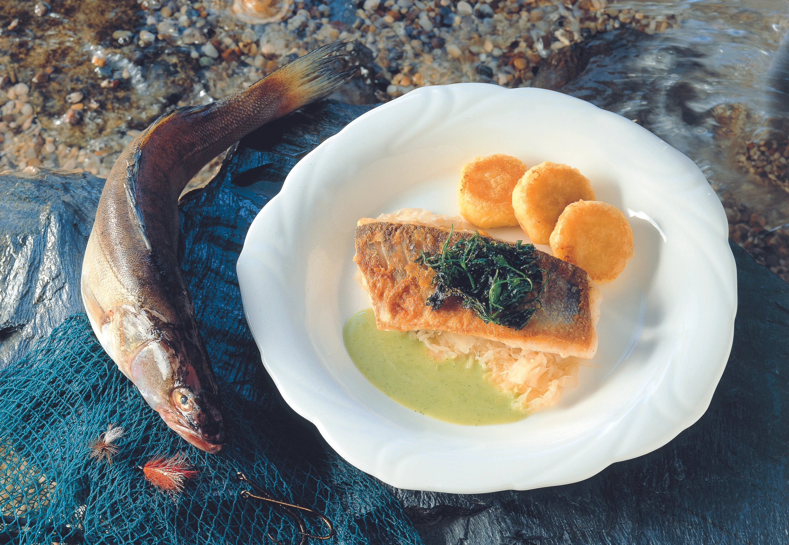 Fisch aus der Pfanne heben, gut abtropfen lassen und mit der Sauce sowie Erdäpfellaibchen und Rieslingkraut als Beilagen anrichten.