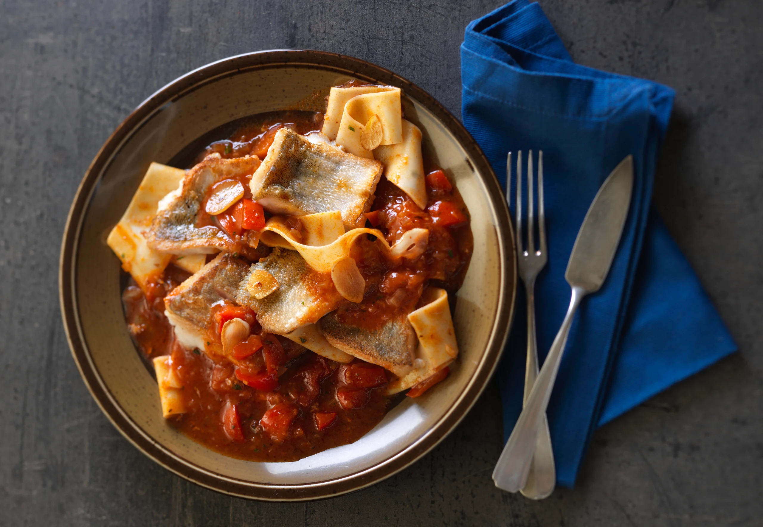 Fischfond, Pelati und gewürfelten Knoblauch zugeben. Sauce mit Salz und Pfeffer würzen und ca. 45 Minuten köcheln.
