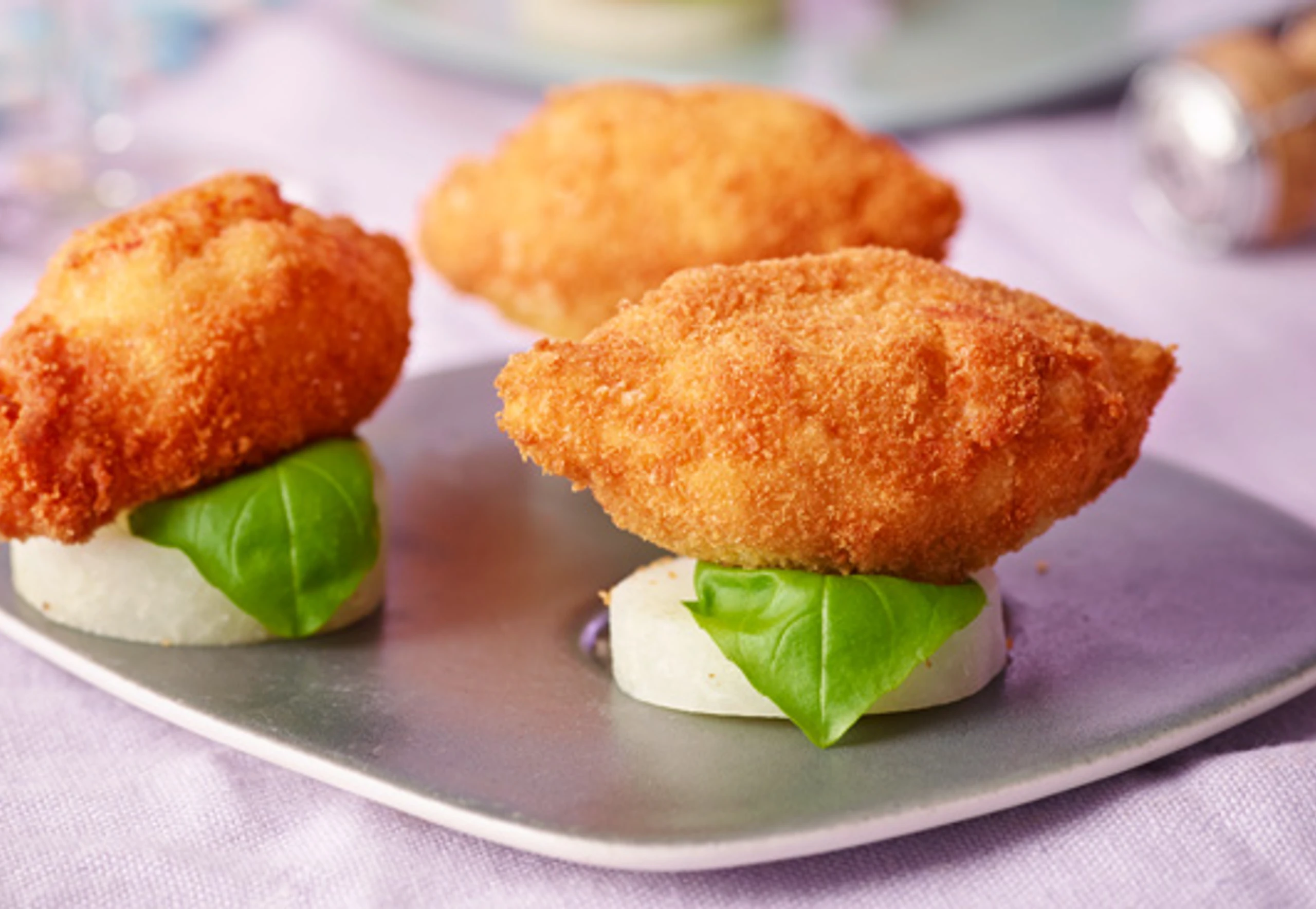 Kohrabischeiben mit je 1 Basilikumblatt und einer Krokette anrichten.