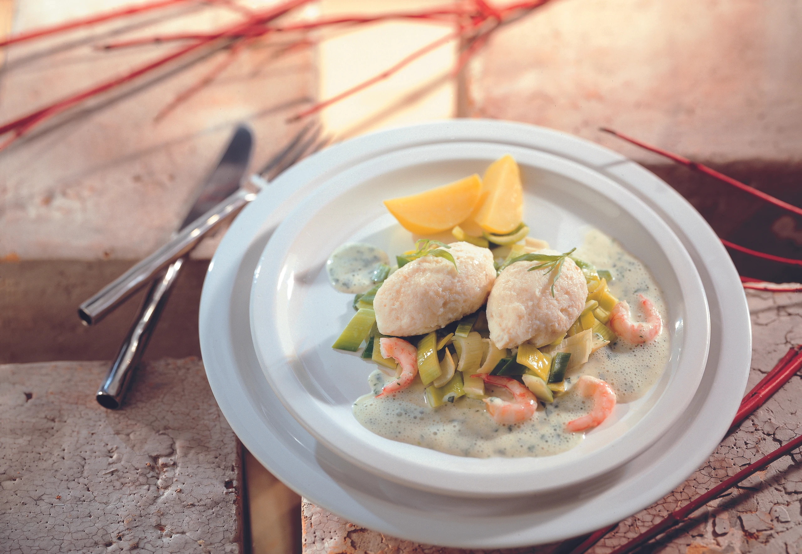 Fischfond oder Wasser aufkochen. Aus dem Mus mit einem Suppenlöffel 8 gleich große Nockerl ausstechen, in den schwach wallenden Fond legen, zudecken und auf kleiner Flamme ca. 10 Minuten ziehen lassen – die Nockerl bleiben bis zum Servieren im Kochfond (am besten mit eingeöltem Backpapier bedecken).