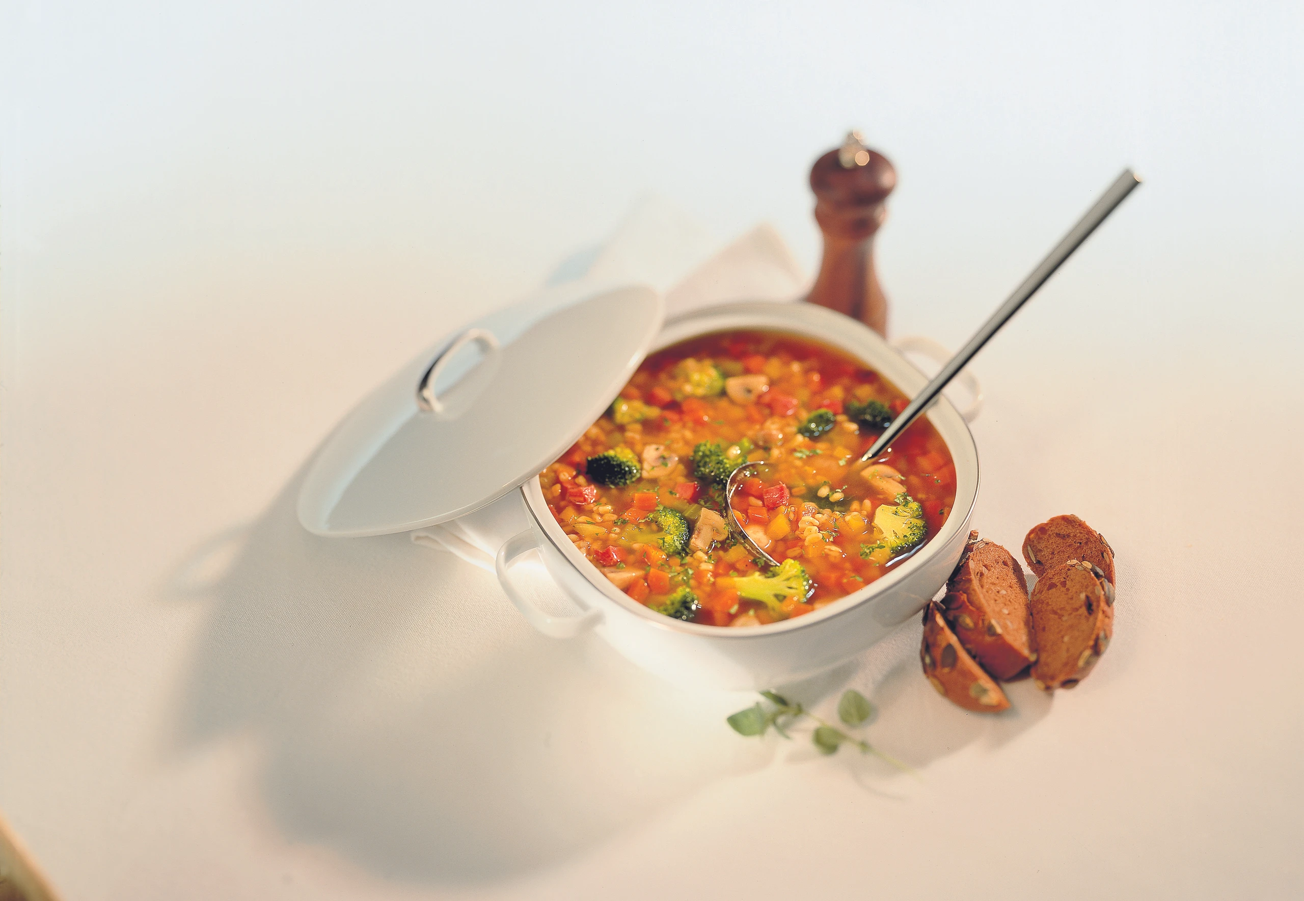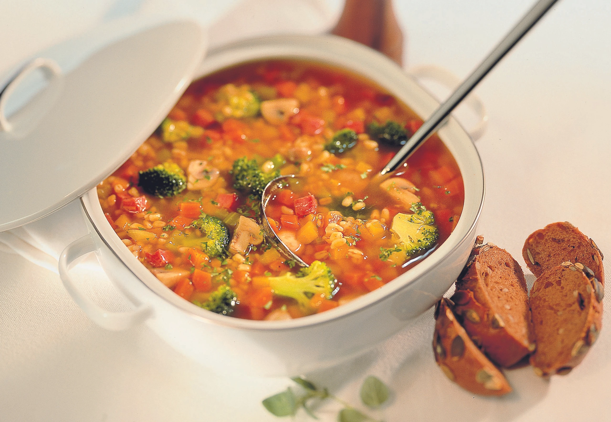 - Zwiebel und Gemüse in Öl hell anschwitzen, mit Suppe aufgießen und aufkochen. Mit Salz, Pfeffer und zerdrücktem Knoblauch würzen und das Gemüse bissfest kochen.