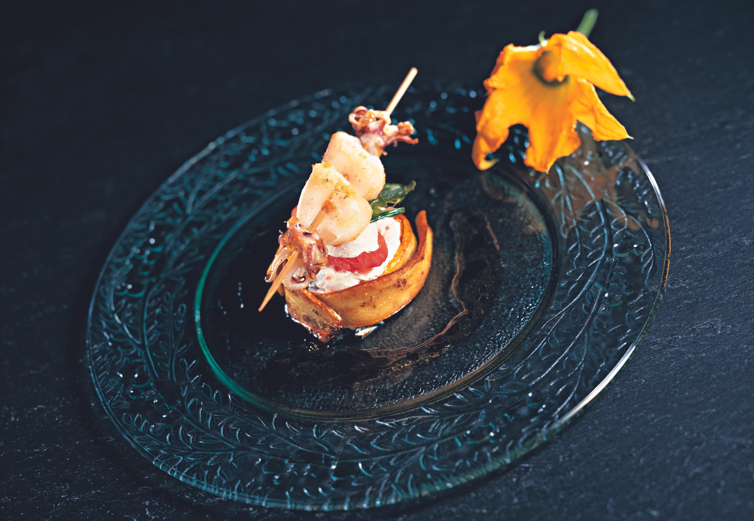 Ziegenfrischkäse im Zucchiniring mit Tintenfischspießen