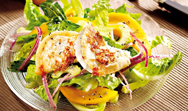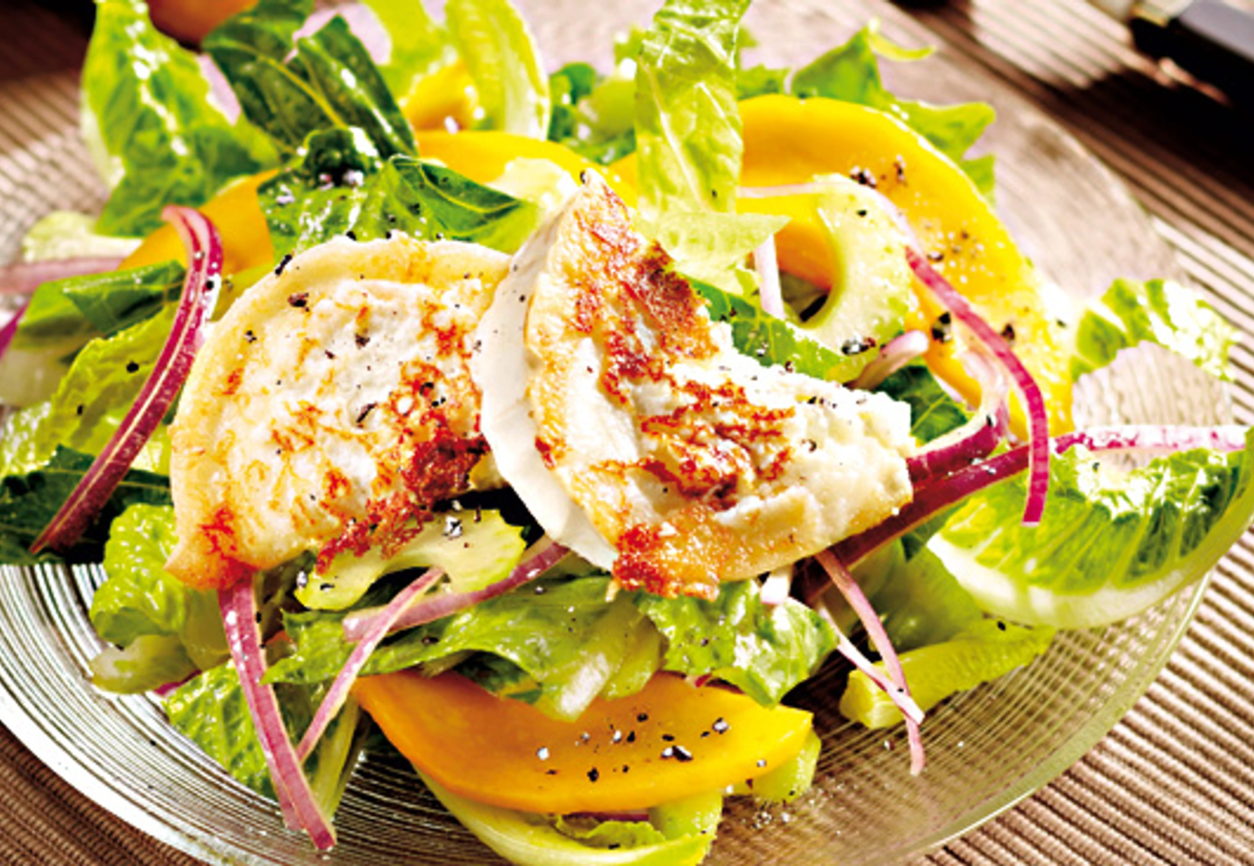 - Käse in ca. 3 cm dicke Scheiben schneiden, halbieren und in einer beschichteten Pfanne in 3 EL Öl beidseitig braten. Käse pfeffern. Salatstreifen auf Tellern verteilen und die Mango-Selleriemischung darauf anrichten, Käsestücke darauf verteilen.